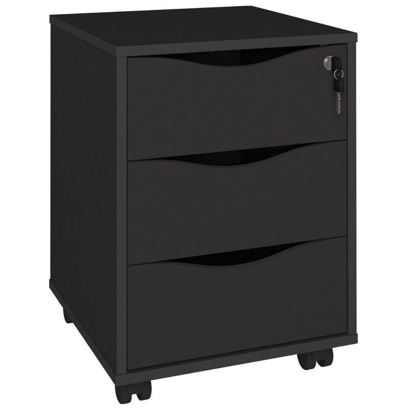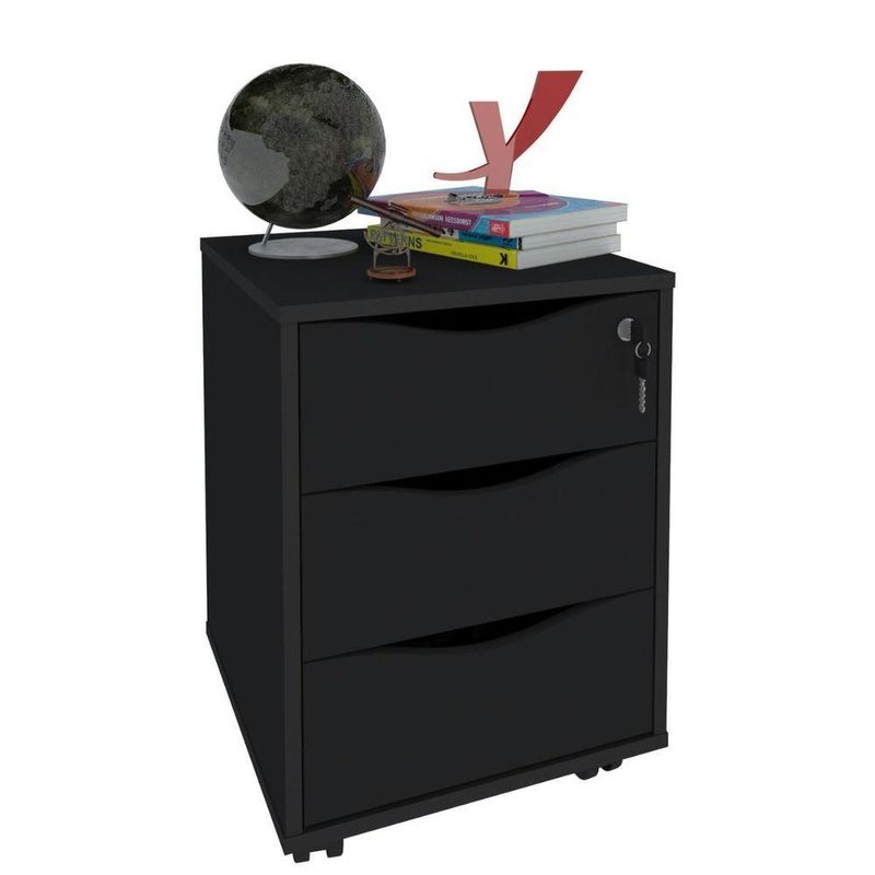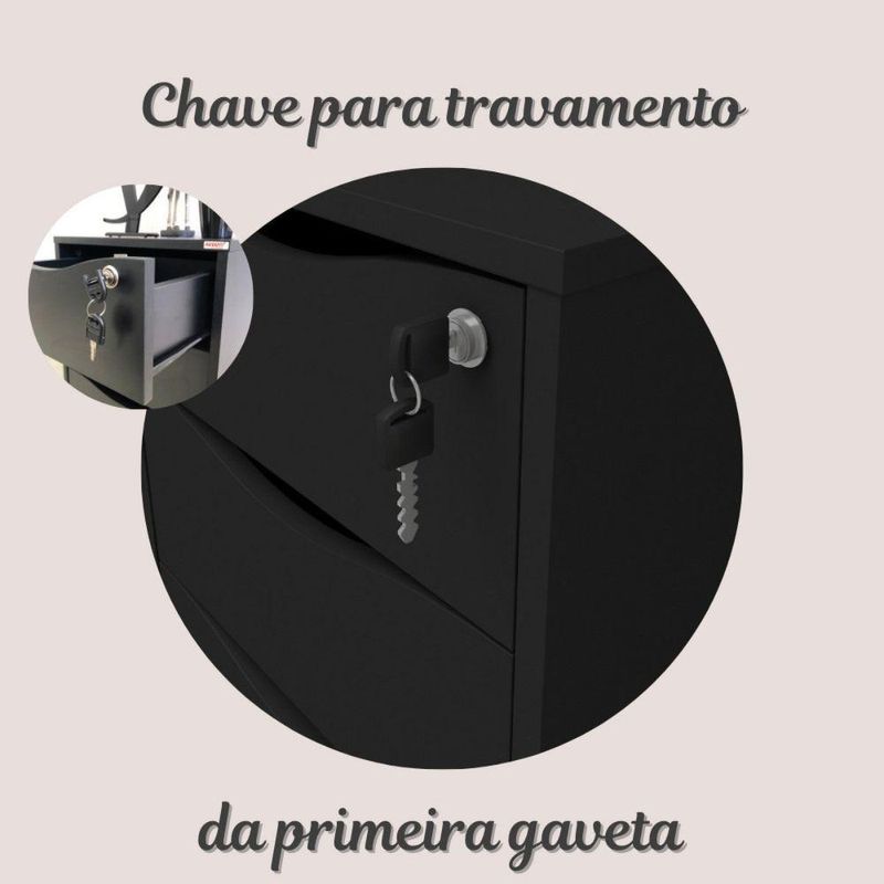 Gaveteiro Com Chave Face PretoGaveteiro com Chave Face Preto - Gaveteiro com 3 gavetas e rodinhas.Gaveteiro Face: Organize seus Espaços com Estilo e PraticidadeO Gaveteiro Face é a combinação ideal de beleza e funcionalidade para transformar seus espaços. Com três amplas gavetas, você terá espaço de sobra para organizar seus materiais e manter tudo em ordem. Seu design versátil se encaixa perfeitamente em qualquer ambiente, do home office ao quarto, adicionando um toque de elegância e praticidade ao seu dia a dia.Qualidade e Durabilidade em Cada DetalheFabricado com estrutura em MDP de 15mm e revestimento em BP, o Gaveteiro Face é resistente a riscos e desgastes, garantindo que seu móvel permaneça impecável por muito tempo. As corrediças de alta qualidade proporcionam um deslizamento suave e silencioso das gavetas, facilitando o acesso aos seus pertences. E para maior segurança, uma das gavetas possui chave, permitindo que você guarde seus objetos mais importantes com tranquilidade.Praticidade e Mobilidade para Facilitar sua VidaCom quatro rodinhas, o Gaveteiro Face oferece mobilidade e praticidade para você reorganizar seus espaços sempre que desejar. Transporte-o facilmente de um cômodo para outro, sem precisar esvaziar as gavetas. Sua montagem é simples e acompanha manual detalhado, para que você possa desfrutar do seu móvel em poucos passos.Organize seus Espaços com EstiloO Gaveteiro Face é a escolha ideal para quem busca otimizar o espaço com elegância e praticidade. Com design versátil, acabamento impecável e garantia de 3 meses, ele é a solução perfeita para manter seus ambientes organizados e funcionais, sem abrir mão do estilo. Disponível nas cores branco e preto, o Gaveteiro Face se adapta a qualquer decoração, trazendo um toque de personalidade ao seu lar ou escritório.Transforme seus espaços com o Gaveteiro Face e desfrute da organização e do estilo que você merece.Características Gerais do Produto:- Acabamento: BP- Acompanha Manual: Sim- Altura (cm): 54,5 cm- Largura (cm): 40 cm- Profundidade (cm): 40 cm- Peso (Kg): Peso Montado: 14,5 kg- Capacidade de Carga: 8Kg distribuídos- Acabamento da Fita Borda: Fita de borda em PVC com 0,45mm- Corrediças: Metálicas- Matéria-prima: Estrutura em MDP 15mm com fita de borda em PVC com 0,45mm- Quantidade de gavetas: 3 gavetas, sendo 1 com chave.- Sistema de montagem: Fixação com tambor e parafuso minifix- Garantia: 3 meses- Recomendações: Limpeza com pano levemente umedecido.Acompanha o produto:- 1 Gaveteiro Face 1 ManualGarantia:- 3 Meses