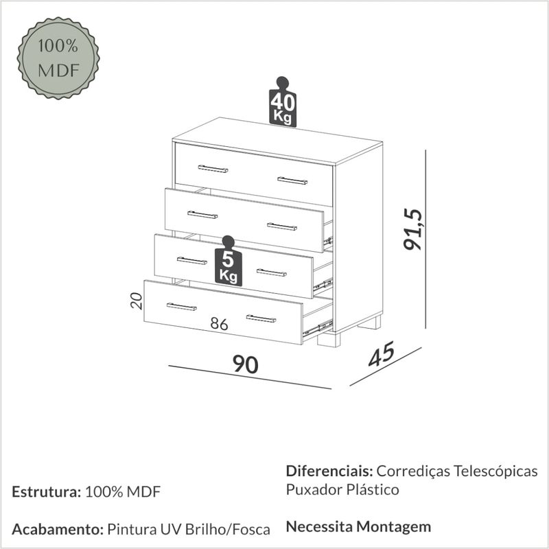 O Gaveteiro Cômoda W344 da Dalla Costa é uma peça elegante e prática, perfeita para adicionar funcionalidade e estilo ao seu espaço. Com dimensões de 90x91,5x45 cm, este móvel é ideal para organizar e armazenar diversos itens com facilidade. Fabricado inteiramente em MDF de alta qualidade, assegura durabilidade e resistência. O design contemporâneo é realçado pelo acabamento sofisticado em Freijó e Off White, tornando-o versátil para combinar com diferentes decorações. As 4 gavetas espaçosas oferecem amplo espaço para guardar roupas, acessórios ou documentos, mantendo tudo organizado e ao alcance das mãos. O Gaveteiro Cômoda W344 é a escolha perfeita para quem busca um móvel funcional e com um toque de modernidade para o lar.