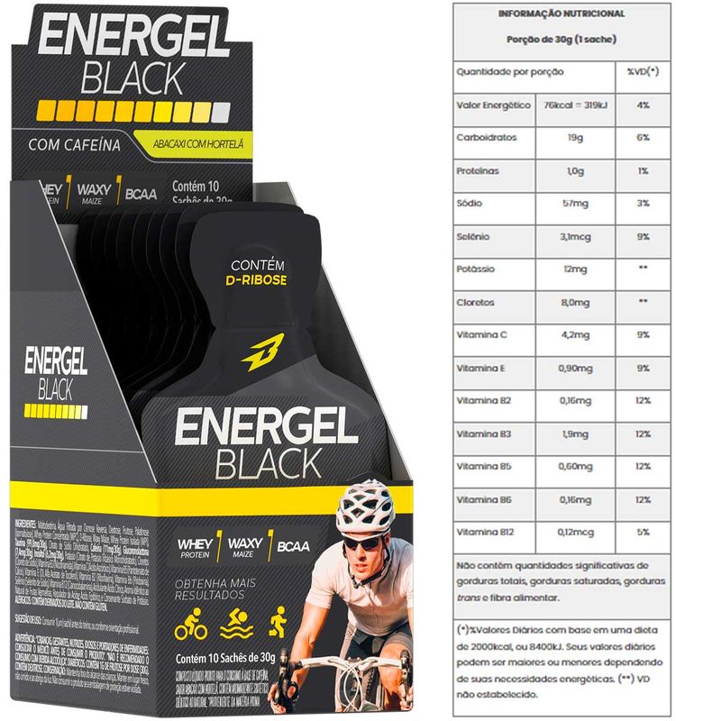 Energel Black - 300g - BodyAction (10 Sachês) Energel Black (10 Sachês de 30g) BodyAction é formulado com um mix completo de carboidratos em suas diferentes formas, como a Palatinose, Frutose, D-Ribose e Waxy Maize, que garantem o aporte energético ideal para antes, durante e depois das atividades físicas. Sua absorção de forma gradual e contínua, retarda a fadiga precoce e mantém a reposição de glicogênio muscular. Adicionado de eletrólitos, mantém o equilíbrio isotônico garantindo um melhor desempenho e recuperação. Contém cafeína, que mantém o estado de alerta ativo e ainda dá o pique necessário para o melhor rendimento nas atividades. Energel Black é indicado para atletas de todas as modalidades esportivas que necessitam de uma boa fonte de energia para otimizar a performance durante o treinamento ou competição. Por estar na forma de gel, favorece uma absorção equilibrada, evitando o desconforto que pode ser causado pela sensação de estômago pesado. * Antes do consumo, sugerimos que leia atentamente a embalagem. Todas as informações sobre produtos possuem apenas propósitos educativos e não tem a intenção de substituir diagnósticos, prescrições ou orientações profissionais. Imagem meramente ilustrativa. Benefícios - Explosão, manutenção, duração; - Taurina + cafeína + inositol; - wpi; wpc; D-ribose, waxy maize; Sugestão de Uso Consumir 1 sachê antes do treino, ou conforme orientação profissional. Para melhores resultados em atividades como musculação e artes-marciais, é indispensável consumir Energel Black 15 minutos antes do exercício ou competição. Em competições prolongadas, fazer reforço da dose a cada 45 minutos, ou de acordo com a orientação técnica.