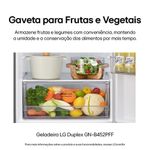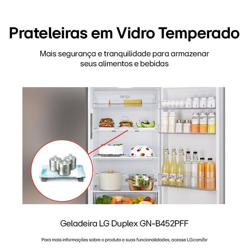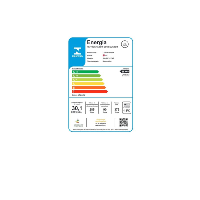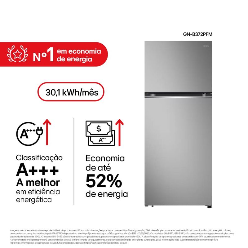 Eficiência Energética SuperiorA Geladeira LG Frost Free GN-B372PFM oferece eficiência energética de classe A+++, proporcionando economia significativa de energia. Graças ao Compressor Smart Inverter, ela ajusta o consumo conforme a necessidade, garantindo desempenho confiável e sustentável com menor impacto ambiental.Refrigeração Precisa e UniformeCom as tecnologias Linear Cooling e Multi Air Flow, a geladeira mantém a temperatura uniforme em todos os cantos, preservando os alimentos frescos por mais tempo. Essas funções garantem que variações de temperatura sejam minimizadas, preservando a qualidade dos alimentos.Praticidade no ArmazenamentoA prateleira deslizante oferece flexibilidade para organizar itens de diferentes tamanhos, enquanto as prateleiras de vidro temperado suportam maior peso com segurança. Com uma capacidade total de 375 litros, sendo 90 litros dedicados ao freezer, há espaço suficiente para armazenar alimentos para toda a família.Controle Simples e InteligenteO controle de temperatura no freezer e no refrigerador facilita o ajuste ideal para diferentes tipos de alimentos. Essa funcionalidade permite personalizar a refrigeração de acordo com suas necessidades, garantindo frescor e economia.Design e Funcionalidade ModernosCom acabamento inox look, design premium e iluminação LED interna, a geladeira combina elegância e praticidade. A tecnologia Frost Free elimina a necessidade de descongelamento manual, tornando o uso diário mais prático e eficiente.