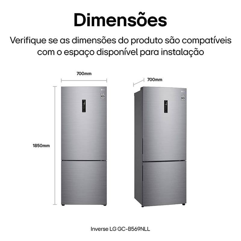 CaracterísticasTipo: InverseQuantidade de Portas: 02Frost Free Portas ReversíveisPrateleiras: Vidro TemperadoDegelo AutomáticoControle Automático de TemperaturaGavetas: Frutas e VegetaisTecnologia de Refrigeração Inverter: Compressor Smart InverterLinear CoolingDoorCooling+Multi Air FlowConectividade ThinQSmart DiagnosisDesign Premium Especificações TécnicasModelo: GCB569NLLCor: Platinum InoxCapacidade Total: 451 LitrosCapacidade de Armazenamento do Freezer: 122 LitrosCapacidade de Armazenamento do Refrigerador: 329 LitrosSelo Procel (Eficiência Energética): A++Consumo de Energia: 35,3 KwhVoltagem: 110V/220V (não é Bivolt)EAN: 8806084204813 (110V) / 8806084204837 (220V)Garantia: 12 meses Dimensões e PesoDimensões do produto com puxador (AxLxP): 1850x700x700 mmDimensões do produto com embalagem (AxLxP): 1934x747x772 mmPeso do produto sem embalagem: 86 KgPeso do produto com embalagem: 95 Kg Itens Inclusos01 RefrigeradorManual de Instruções Agente ValidadorProduto possui certificação de segurança compulsória, certificado pela 010484/2022, organismo acreditado pela CGCRE do Inmetro. Serviço de Instalação e Orientação de Uso Para sua comodidade, a Fast Shop dispõe do serviço de Instalação* e Orientação de Uso, com equipe especializada e autorizada pelo fabricante que poderá realizar a medição de todos os acessos, retirando as portas do produto caso necessário. Esse serviço pode ser adquirido através do nosso canal Blá pelo WhatsApp no número (11) 3232-2949 ou em uma de nossas lojas. Consulte os valores e regiões atendidas.* Verifique com nossos vendedores se a Fast Shop realiza a instalação desse produto.* A Fast Shop não realiza instalação de produtos a gás (consulte o fabricante).