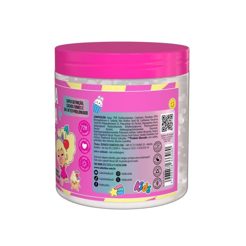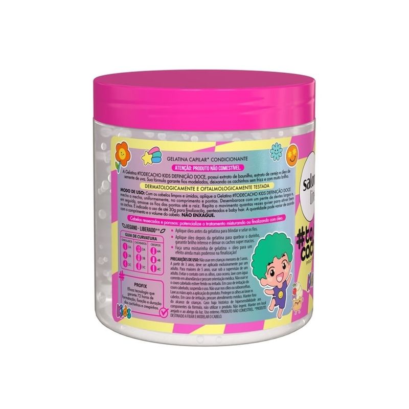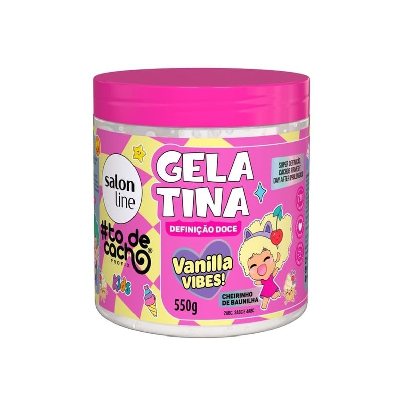 Gelatina Capilar Salon Line Kids Vanilla Vibes 550g Definição, brilho e cuidado especial para os cachinhos das crianças! A Gelatina Capilar Salon Line Kids Vanilla Vibes foi desenvolvida especialmente para cuidar dos cabelos infantis com muito amor. Sua fórmula leve e nutritiva proporciona definição perfeita, controle do frizz e brilho intenso, mantendo os fios macios, soltinhos e com cheirinho delicioso de baunilha. Descrição do Produto A Gelatina #todecacho Kids Vanilla Vibes garante cachinhos modelados da raiz às pontas, com movimento natural e toque suave. Ideal para finalizar e realçar os cachos das crianças, sua textura delicada ajuda a desembaraçar facilmente e mantém os fios hidratados por mais tempo. Proporciona fixação duradoura, day after prolongado e um aroma adocicado irresistível que as crianças adoram! Principais Ativos Extrato de Baunilha: rico em propriedades nutritivas e antioxidantes, auxilia na reparação e fortalecimento dos fios, garantindo maciez e suavidade; Extrato de Cereja: promove hidratação intensa e brilho natural, deixando os cachinhos sedosos e definidos; Óleo de Semente de Uva: nutre profundamente e mantém os fios protegidos e saudáveis. Benefícios Define os cachinhos da raiz às pontas; Proporciona brilho intenso e maciez prolongada; Controla o frizz e facilita o desembaraço; Textura leve, ideal para uso infantil; Fixação duradoura e day after prolongado; Com cheirinho doce e encantador de baunilha. Modo de Uso Com os cabelos limpos e úmidos, aplique a Gelatina Capilar Salon Line Kids Vanilla Vibes mecha a mecha, do comprimento às pontas. Espalhe uniformemente, desembarace com pente de dentes largos e amasse os fios de baixo para cima para ativar os cachos. Não enxágue. Utilize até 30g, conforme o volume e comprimento do cabelo. Dicas de Finalização Antes da gelatina: aplique um óleo capilar para proteger e selar os fios; Depois da gelatina: adicione algumas gotas de óleo para brilho extra e maior durabilidade; Misturinha poderosa: combine creme para pentear + gelatina + óleo até obter uma textura uniforme e aplique mecha a mecha para cachinhos ainda mais definidos. Conservação Conservar em local fresco e seco, ao abrigo da luz solar; Manter a embalagem bem fechada após o uso; Evitar contato com os olhos e manter fora do alcance de crianças pequenas.