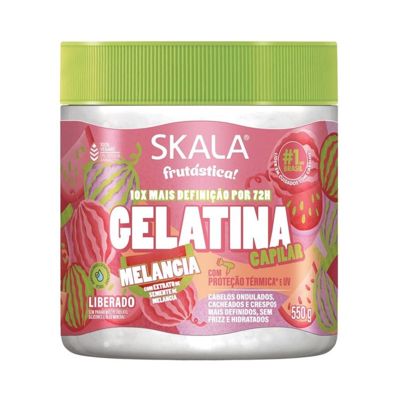 Gelatina Capilar Skala Frutástica Melancia 550g O que é a Gelatina Capilar Skala Melancia? A Gelatina Capilar Skala Frutástica Melancia chegou para dar um toque frutado, divertido e refrescante à sua rotina de cuidados com os cabelos! Este finalizador é ideal para quem quer garantir aquela definição especial aos fios, proporcionando uma experiência sensorial única com um aroma irresistível de melancia. Perfeita para deixar seus cachos radiantes e prontos para arrasar! Por que escolher a Gelatina Skala Melancia? Mergulhe na refrescância da melancia para revitalizar seus cachos. Sua fórmula contém Extrato de Semente de Melancia, ativo ideal para trazer maciez, brilho e força aos fios, além de garantir nutrição e definição duradoura. Além disso, o produto atua como Protetor Térmico e UV, formando uma película ao redor da fibra capilar para defendê-la de altas temperaturas (até 230 graus) de secador e difusor. Benefícios Principais e Diferenciais Definição: Ideal para dar forma e definição especial aos cachos. Proteção Térmica e UV: Defende os fios do calor do secador e difusor. Nutrição e Força: O Extrato de Semente de Melancia proporciona maciez, brilho e força. Acabamento: Cabelos mais definidos, sem frizz e hidratados. Livre de: Sem Parabenos, Petrolato, Silicones e Óleo Mineral. Vegano: Produto 100% vegano e não testado em animais. Modo de Uso Finalização: Aplique nos cabelos úmidos (após o creme de pentear, se desejar), modelando os cachos para obter a definição desejada. Day After: Ótima para reativar e definir os cachos nos dias seguintes à lavagem. Composição INGREDIENTES: Aqua, Glycerin, Carbomer, Polyquaternium-10, PEG-90M, PPG-5-Ceteth-20, AMP-Acrylates/Allyl Methacrylate Copolymer, Parfum, Aminomethyl Propanol, Citrullus Vulgaris (Watermelon) Fruit Extract, Linum Usitatissimum Seed Extract (and) Algin (and) Glyceryl Oleate Citrate (and) Caprylic / Capric Triglyceride, Polysorbate-20, Glycerin (and) Alcohol (and) Achyrocline Satureioides Flower Extract (and) Achillea Millefolium Extract (and) Sodium PCA (and) Fabiana Imbricata Leaf/Stem Extract (and) Arginine (and) Verbascum Thapsus Extract, Benzyl Alcohol (and) Phenoxyethanol, Panthenol, Tocopheryl Acetate, Disodium EDTA, Limonene. Advertências Uso externo. Evite contato com os olhos. Mantenha fora do alcance de crianças.