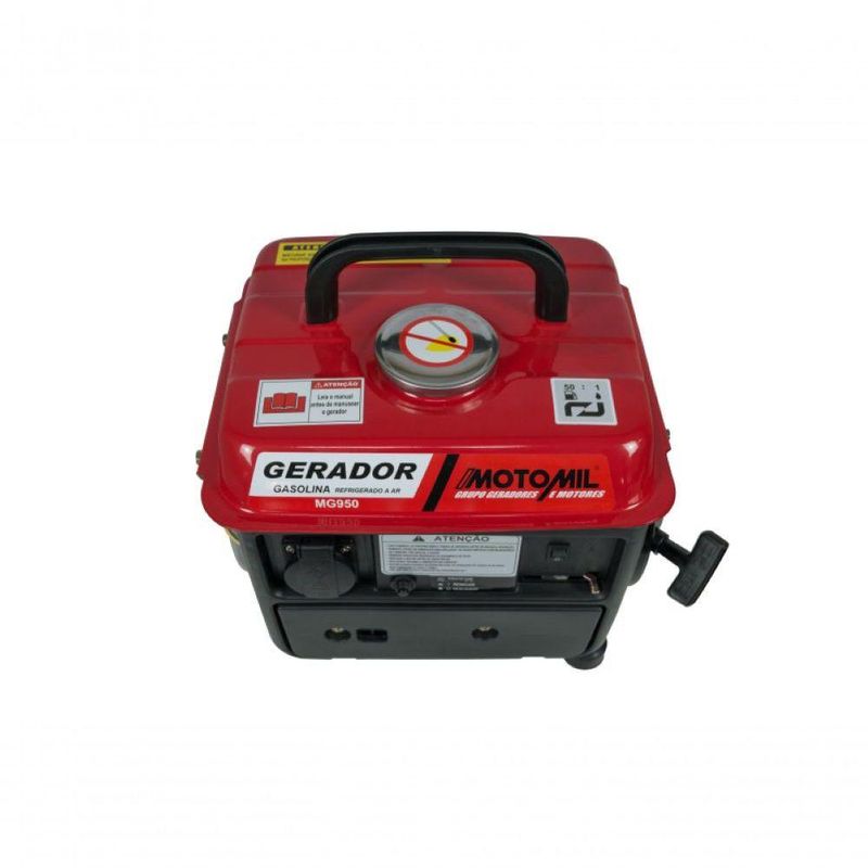 Gerador Gasolina 800W 60Hz 220V Mg-950 MotomilGERADOR À GASOLINA (HOBBY)Dados Técnicos:Tensão/Código: 220 (Cód.: 6255.9)Tipo do motor: 2TPotência do motor: 1,5 HP / 1.1KwSistema de partida: Manual Retrátil.Sistema de lubrificação: 2TTipo de Gerador: Brushless Mono.Frequência: 60 HzPotência partida (W): 880Potência trabalho (W): 800Número de fases: MonoCap. Tanque: 4,5 LConsumo: 0,6 L/H NA