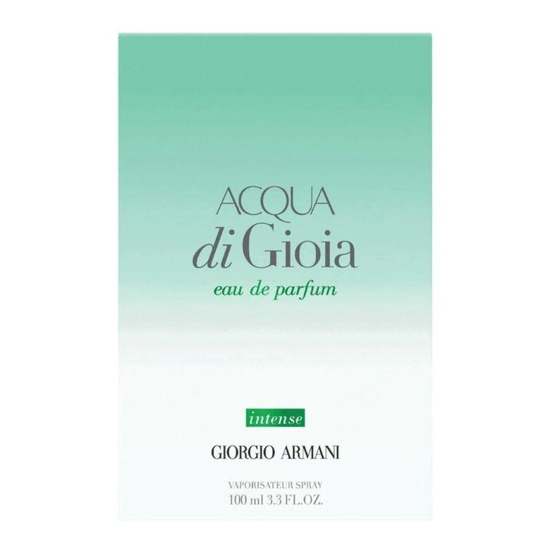 Giorgio Armani Acqua Di Gioia Eau De Parfum Intense - Perfume Feminino 100ml 100 MlO Giorgio Armani Acqua Di Gioia Eau de Parfum Intense é a fragrância perfeita para mulheres que buscam um perfume fresco, vibrante e intenso. Com uma composição que evoca a serenidade do mar e a energia da natureza, esta versão intensa proporciona uma experiência olfativa envolvente e de longa duração. Ideal para mulheres que buscam confiança e elegância em cada momento.Características:Marca: Giorgio ArmaniModelo: Acqua Di Gioia Eau de Parfum IntenseTipo de Produto: Eau de ParfumNotas de Topo: Limão, menta e romãNotas de Coração: Jasmim, rosa e lírio-do-valeNotas de Fundo: Açúcar mascavo, cedro e patchouliBenefícios:Fragrância envolvente: Perfeita para mulheres que buscam frescor com intensidade.Fixação duradoura: Um aroma que permanece ao longo do dia, marcando presença.Elegância e sofisticação: Ideal para momentos especiais ou para o dia a dia.Design refinado: Frasco elegante e moderno, refletindo a exclusividade da marca.Família Olfativa - FloralConcentração - Eau de ParfumOcasião - Ocasião EspecialVersão - 100mlGênero - FemininoNotas de topo - Limão, menta e romãNome do Produto - Giorgio Armani Acqua Di Gioia Eau de Parfum IntenseNotas de fundo - Açúcar mascavo, cedro e patchouli