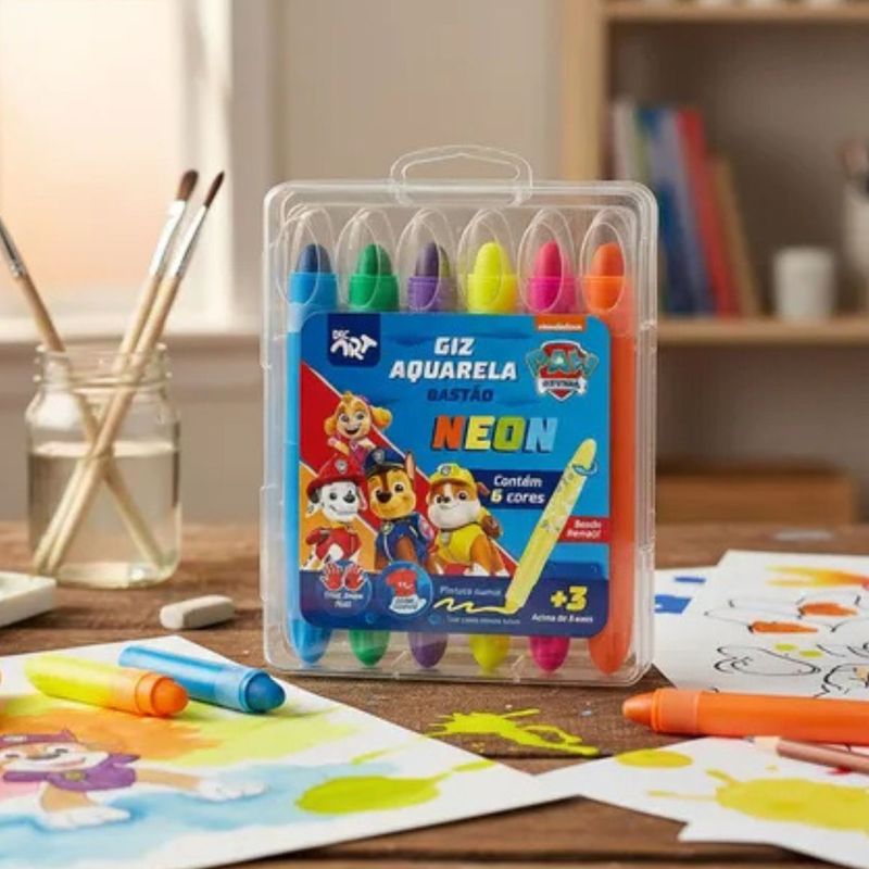GIZ AQUARELA BASTÃO RETRÁTIL NEON 6 CORES PATRULHA CANINA - 4734 - DAC O Giz de Cera Aquarela tem Ponta Retrátil e Cor Neon! Ideal para pequenos artistas, este giz combina a praticidade da ponta retrátil com o brilho encantador das cores neon, permitindo criações deslumbrantes e cheias de vida. Sua fórmula aquarelava facilita a mistura e a criação de efeitos incríveis com água, enquanto a ponta retrátil garante que tenha sempre a quantidade certa exposta, sem desperdícios. Com cores vibrantes e duráveis, é ideal para escola, ou simplesmente para soltar a imaginação. Embalagem: 6 cores neon, oferecendo variedade e possibilidades criativas para os desenhos. Fácil de limpar: Superfícies e roupas podem ser rapidamente limpas, garantindo que a diversão não deixe marcas permanentes. Experiência de pintura confortável: Sua textura suave e macia torna a pintura uma atividade agradável e fácil para todas as idades. Certificado: Fórmula não tóxica. Produto seguro e confiável, atendendo aos padrões de qualidade e segurança para crianças. Inmetro: Registro 015 433/2024, INNAC OCP 0061