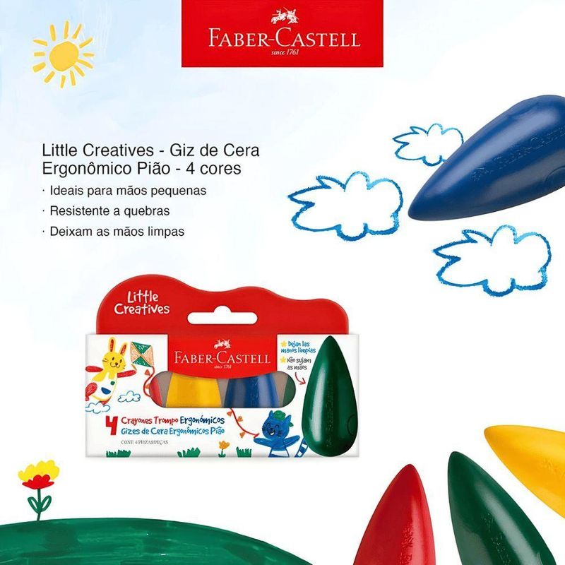 Giz De Cera Ergonômico Pião 4 Cores Faber-castellLinha Little Creatives: Desenvolvido especialmente para crianças pequenas explorarem o mundo da criatividade desde seus primeiros anos.Características:Não sujam as mãos;Ergonômicos, ideais para mão pequena;Marca: Faber-Castell.A hora da arte ficou mais divertida e confortável com o Giz de Cera Ergonômico Pião da Faber-Castell!Acompanha o produto: - 1 Estojo de Giz de Cera Ergonômico Pião 4 Cores FABER-CASTELL