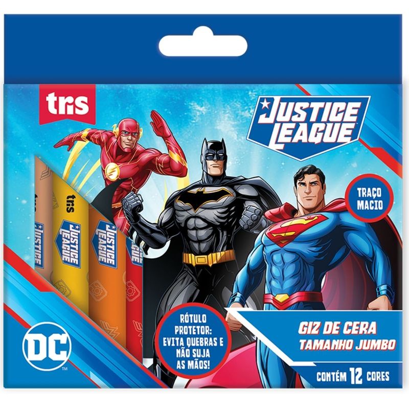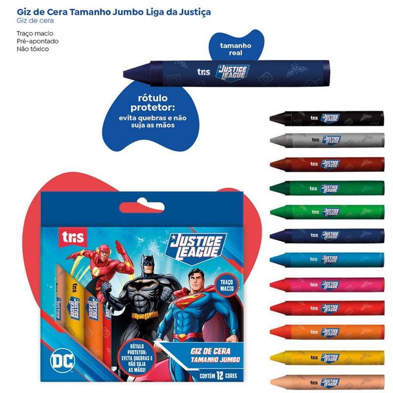 GIZ DE CERA JUMBO LIGA DA JUSTIÇA - 12 CORES - TRIS Prepare-se para uma missão cheia de cores! O Giz de Cera Tris Jumbo Lga da Justiça é o companheiro perfeito para os pequenos aventureiros que estão dando seus primeiros passos no mundo das artes. Unindo a resistência necessária para a fase escolar com o carisma dos herois mais famosos da TV, este giz torna o aprendizado muito mais empolgante. Destaques do produto: Formato Jumbo: Mais robusto e fácil de segurar, ideal para o desenvolvimento da coordenação motora das crianças pequenas. 12 Cores Intensas: Uma paleta vibrante que garante desenhos cheios de vida e excelente cobertura no papel. Temática Liga da Justiça: Corpo decorado com os personagens favoritos (como Batman, flash e Super Homem), estimulando a imaginação durante a brincadeira. Cera de Alta Qualidade: Escrita macia que desliza facilmente, exigindo menos esforço da criança ao colorir. Corpo com Revestimento de Papel: Ajuda a manter as mãos limpas e protege o giz contra quebras precoces. Atóxico: Totalmente seguro para crianças, seguindo rigorosos padrões de segurança.
