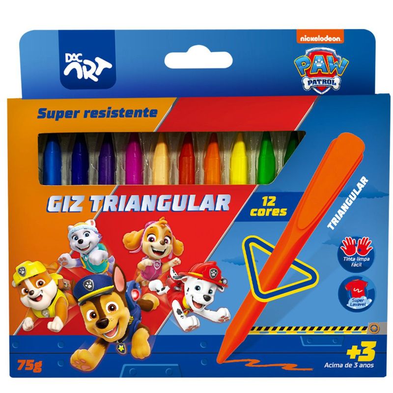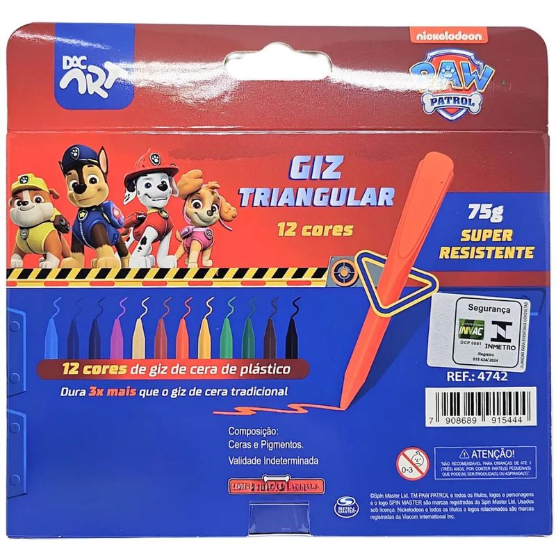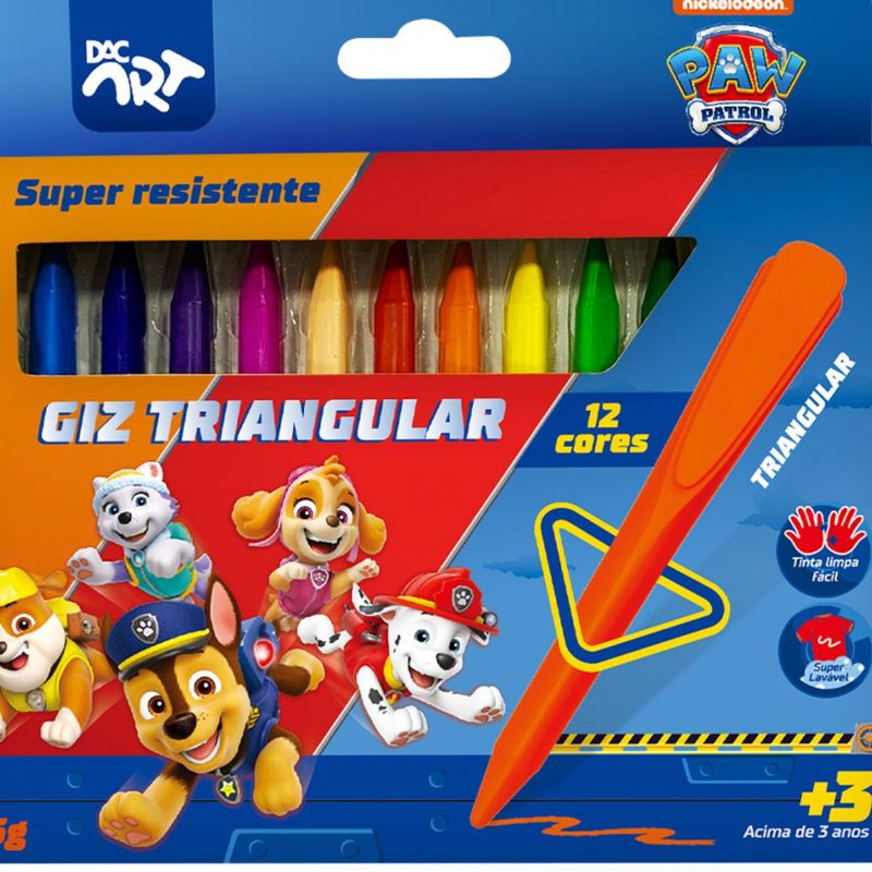 GIZ DE CERA TRIANGULAR PATRULHA CANINA - 12 CORES - 4742 - DAC O Giz de Cera com Ponta Triangular é a escolha ideal para pequenos artistas! Seu design ergonômico facilita a pegada, proporcionando maior controle e conforto durante a pintura. Com cores vibrantes e duradouras, é perfeito para criar desenhos incríveis, desde os detalhes mais finos até grandes preenchimentos. Ideal para escola, ou simplesmente para soltar a imaginação. Características: 12 cores vibrantes, oferecendo variedade e possibilidades criativas para os desenhos. Não sujam as mãos: Desenvolvido para garantir que as crianças possam se divertir sem se preocupar com as mãos sujas. Fácil de limpar: Superfícies e roupas podem ser rapidamente limpas, garantindo que a diversão não deixe marcas permanentes. Experiência de pintura confortável: Sua textura suave e macia torna a pintura uma atividade agradável e fácil para todas as idades. Produto seguro e confiável, atendendo aos padrões de qualidade e segurança para crianças (ACIMA DE 3 ANOS). INMETRO: OCP0061 REGISTRO: 015434/2024