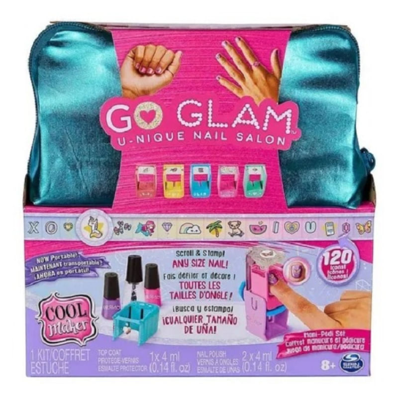 Go Glam Unique Nail Salon Kit Aplicação Pintura De Unhas Mãos e Pés- Manicure e Pedicure - Sunny Este kit de design de unhas em casa permite que você carimbar e estilizar suas unhas da maneira que quiser. Tem tudo o que você precisa para projetar até 250 unhas de qualquer tamanho, incluindo cinco cápsulas de design, esmalte, secador embutido e armazenamento! Ele ainda possui um carimbo removível, perfeito para Glam On-The-Go! Criar manicures personalizadas com qualidade de salão é divertido e fácil de fazer com este kit de unhas para meninas. Selecione um dos designs e coloque-o na máquina. Em seguida, pinte as unhas com uma das cores não tóxicas do esmalte GO GLAM kids (duas incluídas), coloque a mão sob o secador, ligue-o e espere cinco minutos para que as unhas sequem. Use o visor e disque na parte superior da máquina para percorrer os diferentes ícones do pod e, quando estiver pronto, insira o dedo na máquina e pressione para carimbar! Com 120 ícones exclusivos para escolher, você pode misturar e combinar dos pods de design para personalizar suas unhas para a personalização final! Você pode até carimbar mensagens personalizadas como seu nome usando o pod de design de letras! Depois de desenhar suas unhas, pinte em uma camada de top coat brilhante (incluído). E não se esqueça de enfeitar os dedos dos pés também! Deslize a gaveta da máquina, remova o carimbo, separe os dedos dos pés (separador incluído) e repita o processo! Quando terminar, guarde as cápsulas de design na base do kit de manicure e coloque todo o resto no espaço de armazenamento. Leve o carimbo portátil do U-nique Nail Salon com você para qualquer lugar e GO GLAM com seu time! Este kit completo de carimbo de unhas é um ótimo presente para meninas e é a atividade perfeita para festas do pijama, dias de spa, aniversários e muito mais. Idade acima de 8 anos Contem 1 Go Glam U-nique Nail Salon Tamanho da embalagem 21x 20 x 6 cm Fabricante Sunny