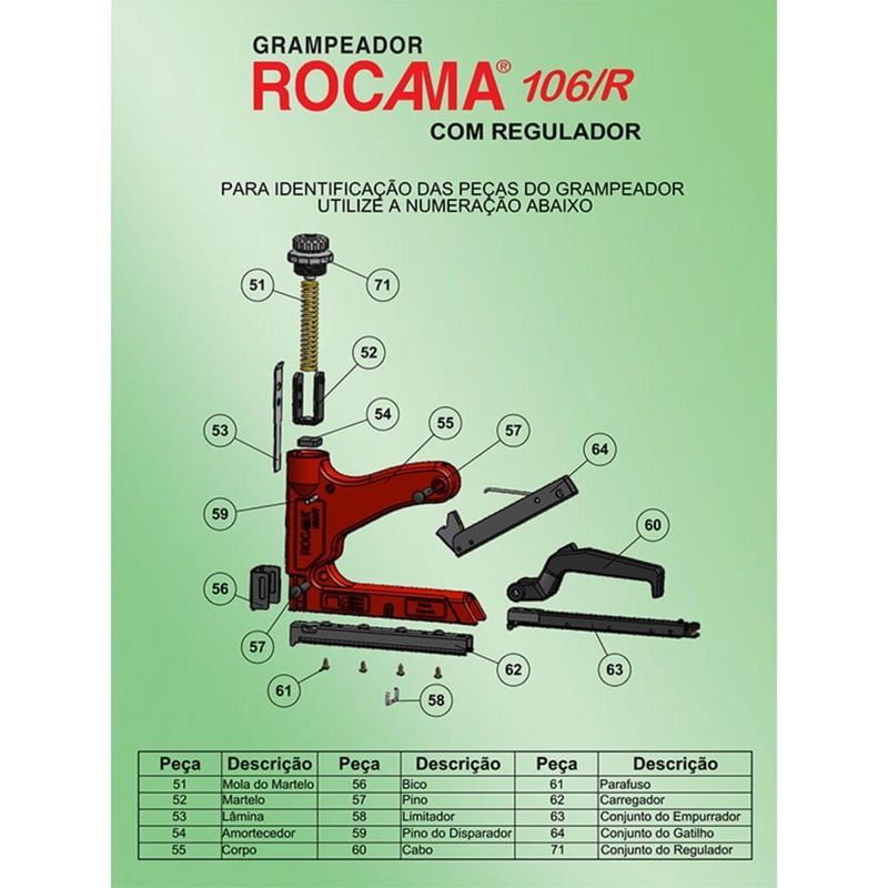 Grampeador Com Regulador De Pressão 106/r - 6 - Rocama Grampeador com Regulador de Pressão 106/R - 6 - ROCAMAAplicação: - Tapeçaria - Fixação Forros, Telas (mosquiteiros) - Fixação Cartazes (escolas, supermercados, etc) - Serigrafia - Marcenaria - Vitrinismo - Hobby - Cartonagem - Embalagem (agricultura, etiquetas de identificação de embalagem) - Decoração (festas infantil, eventos sociais) Utiliza grampos Rocama: - 106/4 - 106/6 - 106/8 * Imagens meramente ilustrativasmeli_shipping_mode - me1
