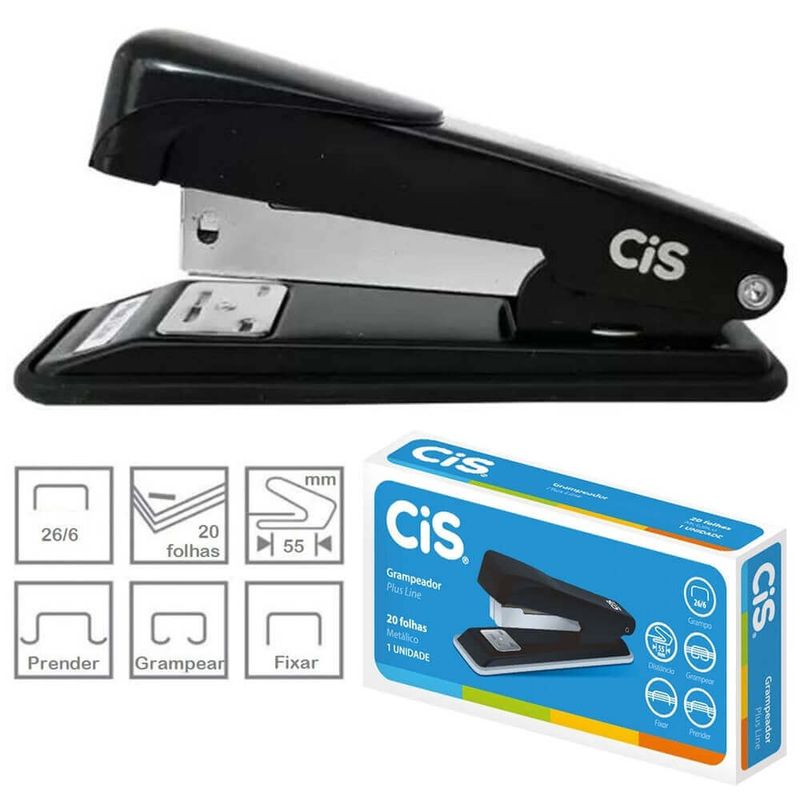 Grampeador Plus Line Preto - CisPara evitar que papéis se percam ou se separem, é muito mais prático grampeá-los e esse modelo é resistente e seguro, ideal para o dia a dia no escritório ou em casa. - Capacidade: Para até 20 Folhas - Corpo metálico preto;- Base com borracha para não deslizar;- Utiliza grampos 26/6 (vendidos separadamente);- Dimensões: 11,7 cm x 3,5 cm x 5,5cm (C x L x A);- Pode ser usado em qualquer ambiente: escritório, escola ou em casa;Embalagem com 01 unidade Produto Atóxico e não perecível;Imagens meramente ilustrativas, as cores podem variar em cada tela ou monitor.