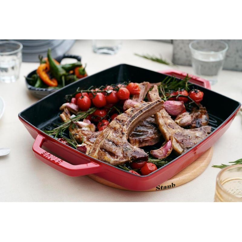 Integrante do grupo ZWILLING desde 2008, STAUB possui panelas de ferro fundido e cerâmica para consumidores que buscam a experiência autêntica e emocional de cozinhar e saborear. Todos os produtos STAUB de ferro fundido esmaltado são produzidos na França sob rigorosos padrões de qualidade que fazem com que a marca seja a escolha dos Chefs.Os utensílios de ferro fundido têm sido utilizados há séculos. Uma das razões é sua excelente durabilidade e eficiência energética do material. O ferro fundido pode ser aquecido ou resfriado a temperaturas extremas.O cozimento no ferro produz maravilhosos aromas assados, sem secar os alimentos. Com a sua aparência inovadora e colorida, a Staub ajuda a reintegrar este tradicional utensílio na cozinha moderna.Com um esmalte preto fosco em sua superfícies interior, esta grelha quadrada é ideal para escaldar, assar ou grelhar seus alimentos de uma forma saudável e também pode ser levada ao forno a 250 graus. Distribui o calor eficiente, uniforme e gradativamente para produzir resultados de cozinha de qualidade superior. Inclui alças auxiliares inteligentes que tornam o uso fácil e prático. Pode ser utilizado em todas as fontes de calor, incluindo a indução. Resistente a riscos e ferrugem. - Especificações: • Comprimento: 29cm• Altura: 4cm• Largura: 23cm• Material: Ferro fundido• Cor: Vermelho cereja• Fontes de calor: Fogão a gás - Fogão elétrico - Fogão a indução - Forno
