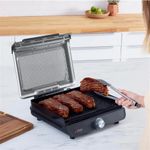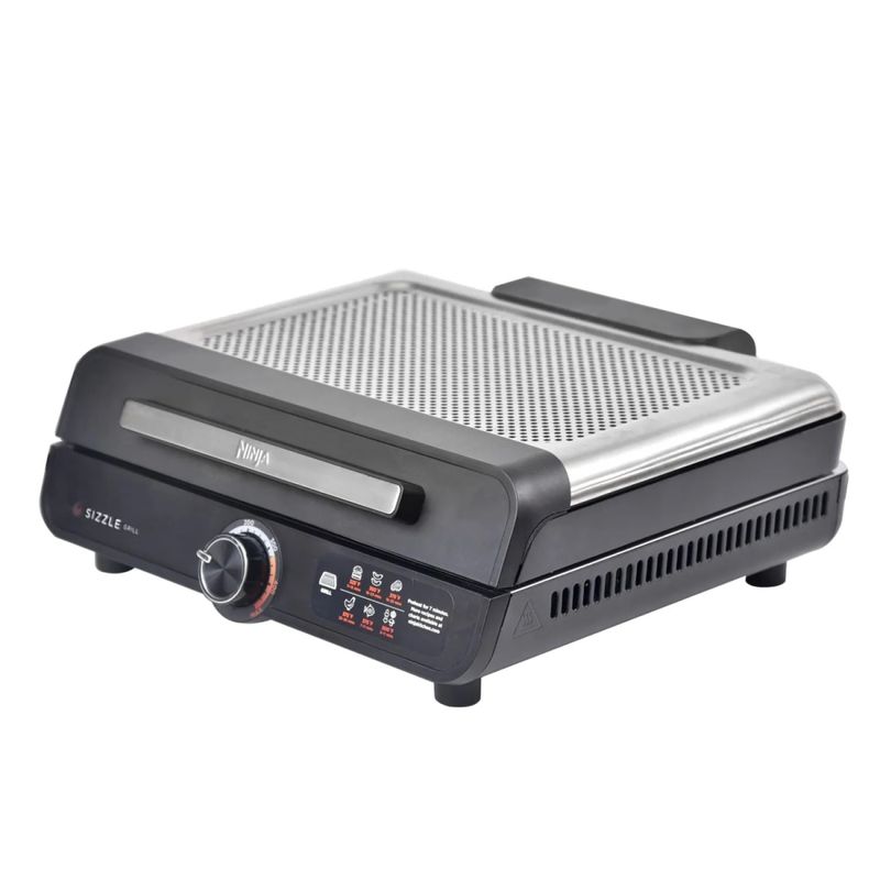 Conheça o Ninja Sizzle™, grill compacta e com tecnologia que diminui a fumaça é perfeito para uso interno. Sele e grelhe suas refeições favoritas diretamente do seu balcão. Com temperaturas de até 260°C e nossa tecnologia que distribui o calor direta e uniformemente de ponta a ponta e a tampa perfurada que elimina a fumaça, você alcança o ponto perfeito e o autêntico sabor de churrasco, sem fumaça e sem sujeira! Temperatura máxima de 260°c: Alcance temperaturas de até 260°c para grelhar e selar, obtenha o ponto perfeito e marcas de grelha como churrasco.Cozimento de ponta a ponta: Sem pontos quentes. Sem pontos frios. Ninja Sizzle grelha de maneira uniforme de ponta a ponta.Grill sem fumaça: A tampa de malha perfurada elimina a fumaça da sua cozinha e reduz os respingos. Além disso, a placa da grelha é equipada com altas bordas e um coletor de gordura para uma experiência de cozimento agradável e preparos mais saudáveis.Capacidade para a família: A placa de grelha de 35cm acomoda meia dúzia de hambúrgueres e peitos de frango, ideal para servir uma família de 4 a 6 pessoas.Limpeza sem esforço: A placa de grelha removível é antiaderente e fácil de limpar, e a tampa de malha perfurada é destacável e segura para lavar na máquina de lavar louça. - Especificações:• Código: 4133250014• Material: Aço inox • Capacidade: 6 hambúrgueres ou peitos de frango• Dimensões: 15,49cm x 38,51cm x 37,39cm• Peso: 3,55kg• Potencia: 1450W• Garantia: 12 meses• Certificação: UL-BR 24.1072