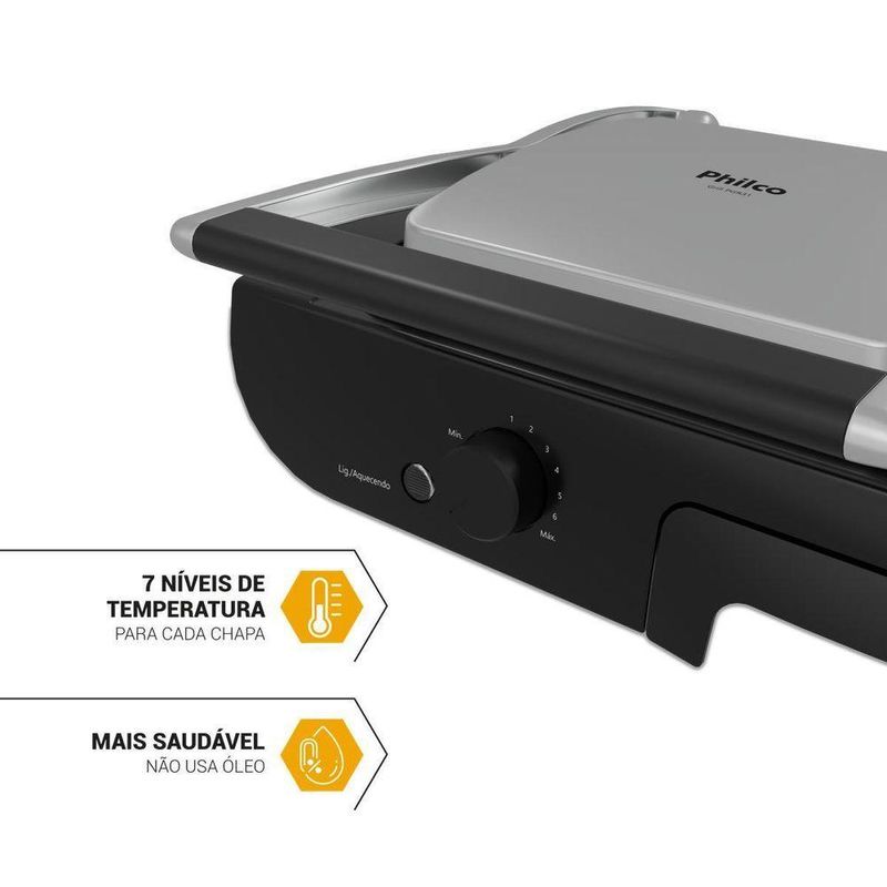 Grill Philco PGR31 7 Níveis De Temperatura 1500W 220VO Grill Philco PGR31 proporciona um preparo eficiente e versátil para suas refeições. Com uma potência de 1500W, garante um cozimento rápido e uniforme, com resultados deliciosos em pouco tempo.Possui 7 níveis de temperatura, sendo possível ajustar individualmente cada chapa, alcançando até 220°C. Isso possibilita preparar diferentes tipos de alimentos ao mesmo tempo, desde hambúrgueres suculentos até legumes grelhados, com o ponto exato de cozimento desejado.Equipado com 2 chapas, o Grill Philco PGR31 é ainda mais versátil, permitindo grelhar um lado do hambúrguer enquanto derrete o queijo no outro, por exemplo. Já o coletor de gordura integrado garante alimentos preparados de forma mais saudável, sem sujeira e sem excesso de óleo.Com acabamento em inox, o Grill Philco é durável e elegante, adicionando um toque especial à sua cozinha. E com a base antiderrapante, oferece maior estabilidade durante o uso, proporcionando praticidade e segurança ao preparar suas refeições.Principais Características:- Possui chapas lisas e onduladas- Chapa do lado esquerdo é ajustável- 2 seletores de temperatura, seletor independente para cada lado da chapa- Os seletores de temperatura possuem 7 níveis, ajuste até 220°C- Luz indicadora de aquecimento para cada lado da chapa- Chapas com revestimento antiaderente- Coletor de gordura com volume de 180ml- Base antiderrapante.Especificações Técnicas:Marca: PhilcoModelo: PGR31Cor: PretoEstado: NovoPotência (W): 1500WTrava de fechamento: NãoFormato da chapa: QuadradaRevestimento da chapa: AntiaderenteAltura do produto: 12 cmLargura do produto: 47 cmComprimento do produto: 29,3 cmPeso do produto: 2,7 kgAltura com embalagem: 35 cmLargura com embalagem: 51,7 cmComprimento com embalagem: 15 cmPeso com embalagem: 3,2 kgGarantia (Dias): 360Observação: Somente faturamos para o nosso consumidor final, ou seja, não faturamos pedidos para CNPJ por este portal de vendas;