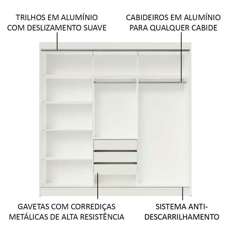 Guarda-roupa Casal Kansas 3 Portas de Correr de Espelho 3 Gavetas MadesaCor: BrancoGarantia: 3 Meses Contra Defeitos de FabricaçãoDimensões - Altura: 218 CmDimensões - Largura: 215 CmDimensões - Profundidade: 54 CmProduto: Guarda-roupaMarca: MadesaPeso Aproximado: 171 KgTonalidade: BrancoMaterial: MdpRbn: Casa/móveis/móveis Para O. Quarto/armários E. Guarda-roupasMaterial Para Filtro: MdpEstado de Origem: RsTempo de do Fornecedor (dias): 1Conteúdo da Embalagem: N/iInstruções/cuidados: N/iO Guarda-Roupa Kansas da Madesa possui três portas de correr com deslizamento suave, trilhos em alumínio para maior resistência e dois puxadores externos. Além disso, todas as portas possuem espelhos, que deixam o móvel muito mais bonito e ampliam o ambiente.O tamanho é pensado especialmente para a necessidade de um casal. A divisão interna é ótima, com muitas prateleiras e nichos, além de três gavetas espaçosas com corrediças metálicas, muito mais seguras e resistentes.Os dois cabideiros são em alumínio e possuem espaços tanto para roupas curtas quanto mais longas. Ou seja, tem lugar pra organizar tudo: roupas, calçados, malas, travesseiros, edredons e muito mais.O acabamento é branco, feito com a Pintura Poliéster exclusiva da Madesa. Esse processo é ecologicamente correto e conserva o móvel por muito mais tempo.Medidas totais do móvel: 218 cm de altura x 215 cm de largura x 54 cm de profundidade.Itens inclusos:- Três (3) portas de correr com sistema anti-descarrilhamento, todas com espelhos- Dois (2) puxadores em PVC- Três (3) gavetas internas com corrediças metálicas- Dois (2) cabideiros em alumínioCódigo do produto: 1018093EMarca: MADESAGarantia: Garantia de 3 meses contra de fabricação