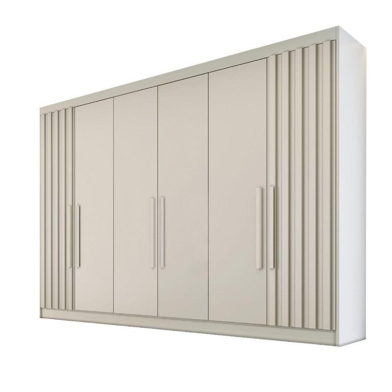 Guarda Roupa 6 Portas 2 Ripadas Potente 100% Mdf Off WhiteO Guarda Roupa 2 Portas Ripadas nas Laterais Potente MDF - Moveis Europa une praticidade, espaco e elegancia em um so item. Seu design moderno e acentuado pelas portas ripadas de madeira, complementado por um acabamento em Verniz UV que proporciona uma escala de brilho semi-brilho e uma durabilidade excepcional. Fabricado em 100 MDF (Madeira de Reflorestamento), o Guarda Roupa destaca-se pelas suas 6 portas elegantes com grandes puxadores em madeira e 6 gavetas internas, uma dessas gavetas possui chave, oferecendo seguranca adicional para seus itens mais preciosos e sao equipadas com puxadores modernos. O Guarda Roupa inclui ainda 2 sapateiras com corredicas telescopicas, prateleiras espacosas e cabideiros em aluminio, garantindo um excelente aproveitamento dos espacos internos e alta durabilidade. Para maior resistencia e durabilidade, o movel conta com costas parafusadas.Caracteristicas: Materiais: 100 MDF (Madeira de Reflorestamento) Acabamento: Verniz UV Escala de Brilho: Semi-Brilho Sistema de Montagem: Parafuso, Minifix e Cavilha Dobradicas: Metalicas Modelo Caneco 35mm Quantidade de Portas: 6 Quantidade de Gavetas: 6 Quantidade de Gavetas com Chave: 1 Quantidade de Prateleiras: 12 Quantidade de Sapateiras: 2 Corredicas: Telescopicas Puxadores Externos: Madeira Cabideiros de Aluminio: Sim Costas Parafusadas: Sim Dimensoes: Altura: 237 cm Largura: 250,50 cm Profundidade: 56 cm Peso: 250,4 kg Garantia do fornecedor: 3 Meses Recomendacoes de Uso, Manutencao e Limpeza: Limpar com flanela ou pano macio seco, nao utilizar produtos abrasivos, desengordurantes, alcool ou solvente. Nao expor o produto diretamente a luz solar e a umidade.