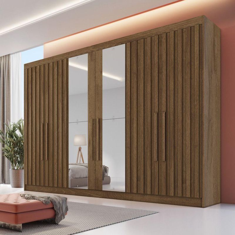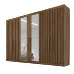 Guarda Roupa 6 Portas Potente 4 Ripado Com Espelho 100% Mdf BraúnaO Guarda-Roupa 6 Portas 4 Portas Ripadas Potente com Espelho MDF - Moveis Europa une praticidade, espaco e elegancia em um so item. Seu design moderno e acentuado pelas portas ripadas de madeira e pelo espelho integrado, complementado por um acabamento em Verniz UV que proporciona uma escala de brilho semi-brilho e uma durabilidade excepcional. Fabricado em 100 MDF (madeira de reflorestamento), o guarda-roupa destaca-se pelas suas 6 portas elegantes com grandes puxadores em madeira e 6 gavetas internas uma delas com chave oferecendo seguranca adicional para seus itens mais preciosos. As gavetas sao equipadas com puxadores modernos.O roupeiro inclui ainda 2 sapateiras com corredicas telescopicas, prateleiras espacosas e cabideiros em aluminio, garantindo excelente aproveitamento dos espacos internos e alta durabilidade. Para maior resistencia e vida util, o movel conta com costas parafusadas. Caracteristicas do produto: Marca: Moveis Europa Modelo: Potente Materiais: 100 MDF (madeira de reflorestamento) Acabamento: Verniz UV Escala de brilho: Semi-brilho Sistema de montagem: Parafuso, Minifix e Cavilha Quantidade de portas: 06 Quantidade de gavetas: 06 Gavetas com chave: 01 Quantidade de prateleiras: 12 Sapateiras: 02 Corredicas: Telescopicas Puxadores externos: Madeira Dobradicas: Metalicas modelo Caneco 3,5 cm Espelho: Sim Material dos cabideiros: Aluminio Costas parafusadas: Sim Dimensoes: Altura: 237 cm Largura: 250,5 cm Profundidade: 56 cm Peso: 267 kg Garantia do fornecedor: 3 meses Recomendacoes de uso, manutencao e limpeza: Limpar com flanela ou pano macio seco. Nao utilizar produtos abrasivos, desengordurantes, alcool ou solvente. Nao expor o produto diretamente a luz solar e a umidade.