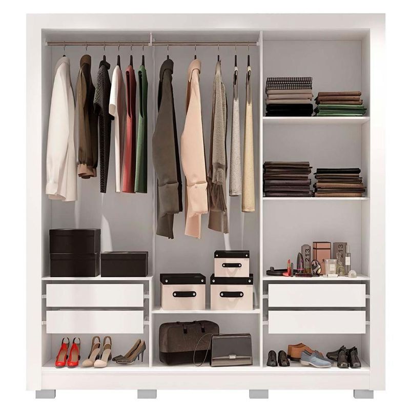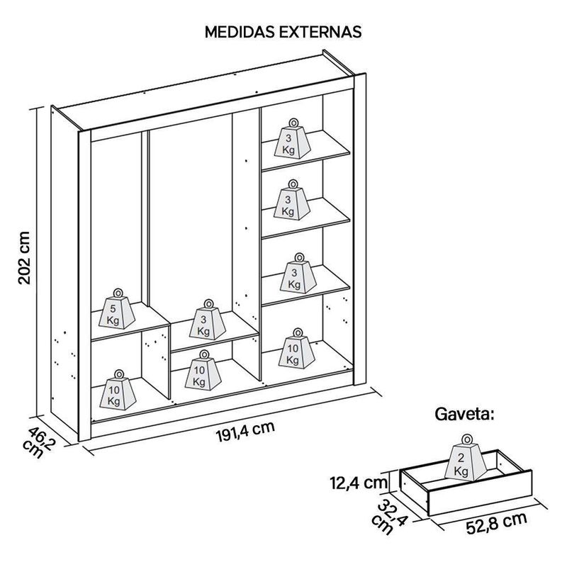 Guarda Roupa Casal 3 Portas 4 Gavetas Com 8 Pés Branco Glass O Roupeiro Glass é um móvel com amplo espaço interno, perfeito para armazenar seus pertences além de possuir design único para completar seu ambiente de descanso. Feito em MDP e HDF possuem maior resistência e durabilidade ao móvel. Dimensões do produto montado:Altura: 202,0 cmLargura: 191,4 cmProfundidade: 46,2 cmPeso: 93 kg Roupeiro GlassPossui 8 PésPossui 3 PortasPossui 5 TamposPossui 6 NichosPossui 1 CabideiroPossui 4 Gavetas Peso SuportadoTampos 3kgGavetas 2kg Acompanha manual de montagemTonalidade do Produto: Branco FoscoEstrutura em MDP de 15mm e 25mm de espessura. HDF de 3mm de espessura. Garantia 90 dias contra de fabricaçãoEste móvel chegará em sua casa separado em 4 volumes Dimensões da embalagem:1º VolumeAltura: 10 cmLargura: 208,2 cmComprimento: 47,3 cm 2º VolumeAltura: 7 cmLargura: 193,9 cmComprimento: 71,5 cm 3º,4º VolumeAltura: 5 cmLargura: 59 cmComprimento: 33 cm Recomendações de limpeza:Limpar com pano macio, seco ou úmido, sem uso de produtos abrasivos. Pois, podem trazer danos ao produto. Sobre a :As transportadoras contratadas, não realizam em apartamentos. Realizando assim a na portaria do prédio. Produto segue desmontado, montagem por conta do comprador.Imagens do produto são meramente ilustrativas.Cor: Branco