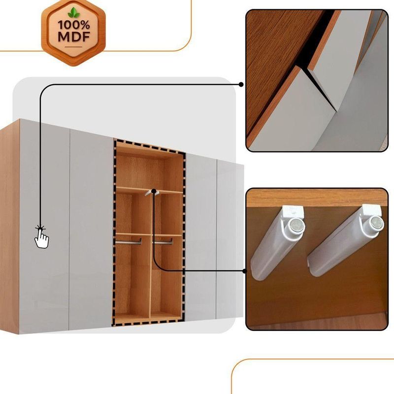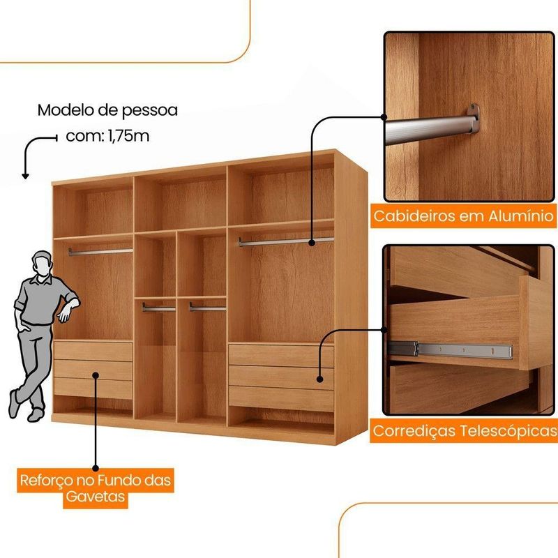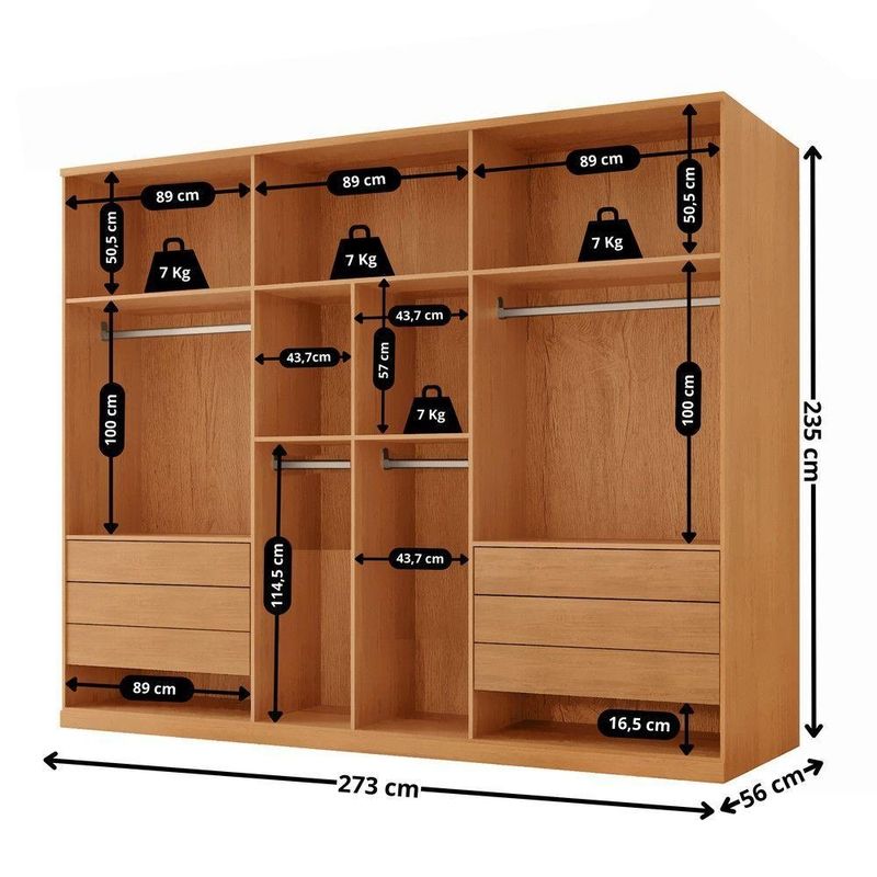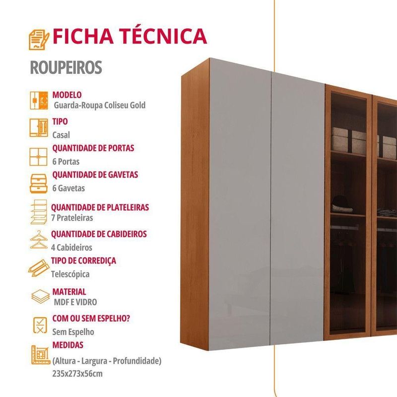 Guarda Roupa Casal Coliseu Gold Mdf Moderna Mobília Naturalle/off White Sem PésO Guarda-Roupa Coliseu Gold traduz sofisticacao, imponencia e tecnologia em um unico movel, desenvolvido para ambientes de alto padrao.Seu design contemporaneo ganha destaque com as duas portas centrais em vidro, que criam um efeito visual elegante e valorizam o espaco com leveza e requinte. As portas com sistema de abertura touch reforcam o conceito clean e minimalista, eliminando puxadores aparentes e elevando o nivel estetico do ambiente. Coliseu Gold oferece ampla capacidade de organizacao, mantendo uma distribuicao interna inteligente e funcional. Diferenciais e Alto Padrao Duas portas centrais em vidro: Elegancia, modernidade e exclusividade Sistema de abertura touch: Tecnologia aplicada ao design, com visual totalmente clean 6 portas amplas: Acesso confortavel e composicao visual equilibrada 6 gavetas espacosas: Organizacao premium para roupas e acessorios Estrutura robusta em MDF de alta qualidade: Maxima resistencia, estabilidade e longa vida util Distribuicao interna inteligente: Funcionalidade aliada ao conforto Acabamento em Pintura UV: Protecao contra desgaste, alem de melhor acabamento visual Caracteristicas: Marca: Moderna Mobilia Modelo: Coliseu Gold Quantidade de Portas: 06 Quantidade de Gavetas: 06 Conteudo da Embalagem: 01 Guarda Roupa Casal Coliseu Gold MDF 6 Portas Dimensoes do Roupeiro: Altura: 235 cm Largura: 273 cm Profundidade: 56 cm Garantia do Fabricante: 03 meses. Informacoes Importantes: As tonalidades das cores podem sofrer alteracao de acordo com o ambiente e a configuracao de cada monitor. Os objetos que ambientam as fotos nao acompanham o produto. Nao disponibilizamos a montagem do produto. Nao nos responsabilizamos por danos no produto causado por montagem. Favor verificar o produto no ato da entrega e em caso de problemas decorrentes no transporte (arranhados, quebra, batida, amassados) deve-se efetuar a ressalva na nota fiscal para conhecimento da transportadora e comunicar imediatamente a loja. Moderna Mobilia reserva o direito de alterar as especificacoes tecnicas sem previo aviso. As medidas contidas no site podem sofrer variacoes de acordo com a montagem, tipo de costura etc. Verifique as dimensoes do produto e certifique-se que o percurso que ele fara ate o local de uso permite sua passagem. Nao esta incluso no servico de entrega o deslocamento ate o interior do apartamento (com ou sem elevador) ou deslocamento em locais de dificil acesso, como escadarias. Caso o cliente necessite de entrega dentro desses padroes, deve entrar em contato com a Loja responsavel para verificar. Se autorizado pela portaria do condominio, as entregas sao feitas no piso terreo, e e o cliente que se responsabiliza por levar a mercadoria ate o proprio apartamento.