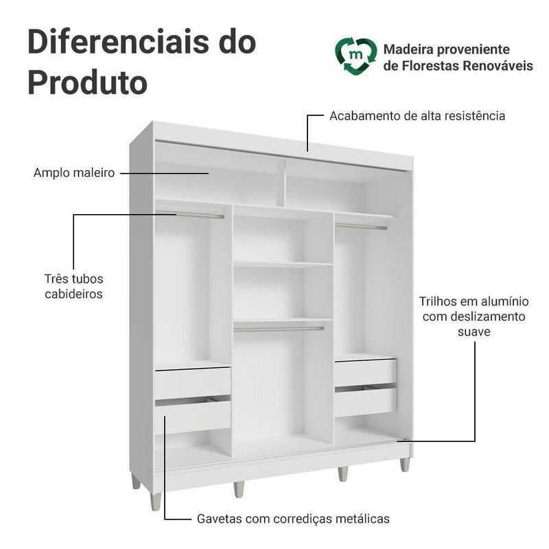Guarda-roupa Casal Com Pés 3 Portas De Correr Com Espelhos Branco/rustic Reno MadesaO Guarda-Roupa Casal Reno da Madesa é a escolha ideal para quem busca organização, praticidade e design moderno no quarto. Com acabamento elegante e materiais de qualidade, ele alia funcionalidade e estilo.Essa versão possui três portas de correr, sendo duas com espelhos, que trazem mais praticidade no dia a dia. Os trilhos de alumínio garantem deslizamento suave e silencioso, otimizando o espaço do quarto. Por dentro, o guarda-roupa oferece quatro gavetas espaçosas com corrediças metálicas e três cabideiros, proporcionando espaço ideal para roupas, acessórios, malas e outros itens, mantendo tudo sempre organizado.O acabamento da estrutura é Branco e das portas no tom amadeirado Rustic, combinando resistência e elegância. Com design pensado para unir beleza e funcionalidade, o Guarda-Roupa Reno com pés é perfeito para transformar o seu quarto em um ambiente moderno e organizado.Medidas:- 180 cm de largura- 54 cm de profundidade- 215 cm de alturaO que você recebe:- Um Guarda-Roupa com três portas de correr sendo duas com espelhoCódigo do produto: 10959B2ECPÉ importante saber:- Material: MDP- Imagens meramente ilustrativas.- A Madesa não disponibiliza de montagem.- Por , é obrigatório fixar o móvel na parede.- O produto segue com manual de instalação e todas as ferragens necessárias para sua montagem.A Madesa se dedica à sustentabilidade com várias iniciativas: temos uma usina própria que gera energia para uma das fábricas. Priorizamos fornecedores responsáveis com o meio ambiente. Todo o plástico utilizado na produção é reciclado, e as sobras também são reaproveitadas. Investimos no desenvolvimento de nossos colaboradores e em ações que beneficiem a comunidade.