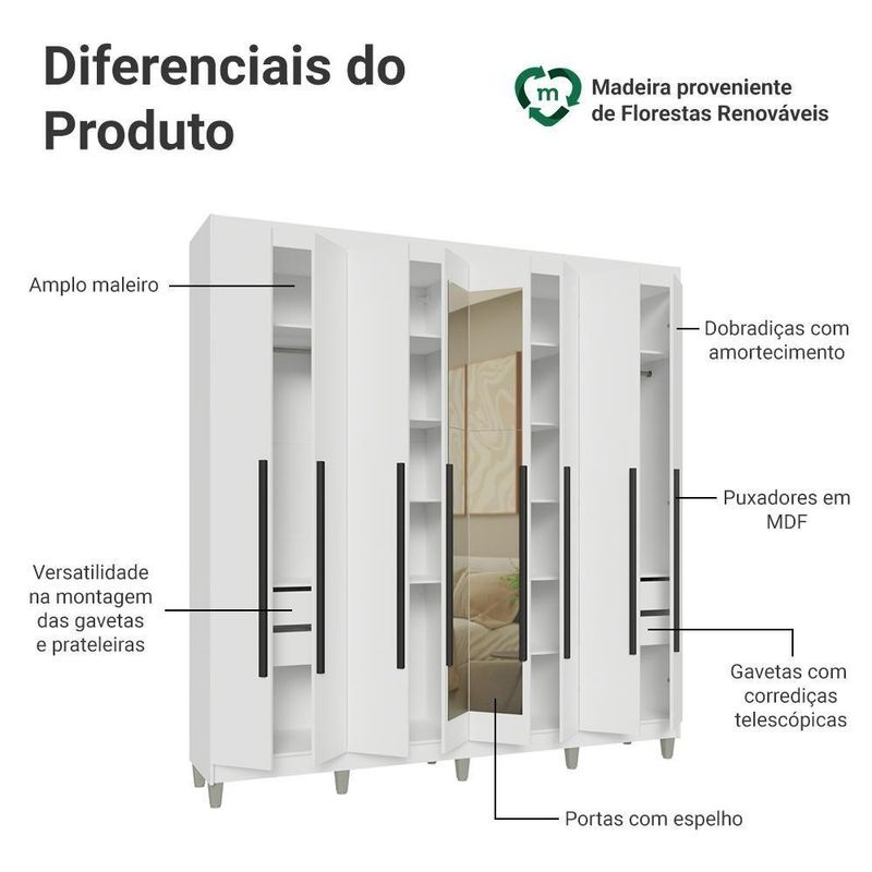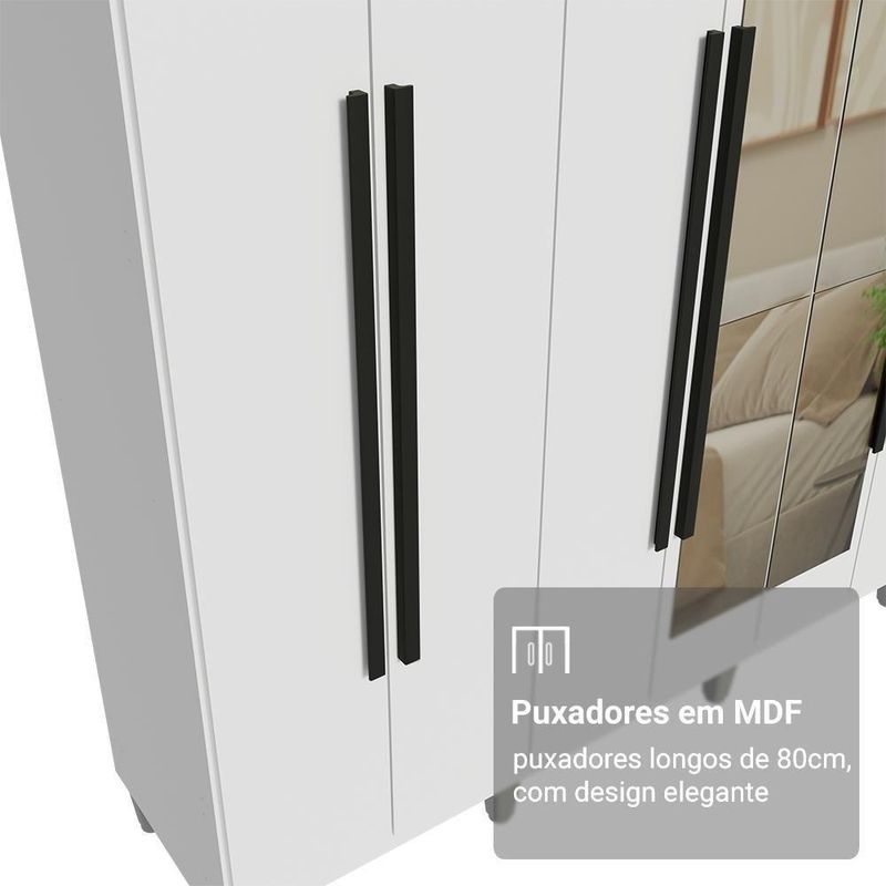 Guarda-roupa Casal Com Pés 8 Portas Batentes Com Espelho Branco/branco/preto Netuno Madesa Branco/branco/pretoDesign moderno, acabamento resistente e amplo espaço: tudo em um só móvel, o Guarda-Roupa 8 Portas Netuno.As portas contam com dobradiças com amortecimento, garantindo fechamento suave, enquanto as gavetas possuem corrediças que permitem abertura total. O maleiro espaçoso é ideal para itens maiores, e as gavetas e prateleiras ajustáveis permitem personalizar o interior conforme suas necessidades. Além disso, as portas do meio contam com espelhos, agregando ainda mais sofisticação ao móvel.A estrutura e as portas são Brancas e os puxadores em Preto, realçando o design do móvel. Os puxadores de 80 cm em MDF destacam o design alongado do guarda-roupa, enquanto os pés elevam o móvel, facilitando a limpeza e valorizando o ambiente.O Guarda-Roupa Netuno é a escolha perfeita para quem busca um móvel funcional, espaçoso e cheio de detalhes que fazem toda a diferença no quarto.Medidas:- 216 cm de largura- 47 cm de profundidade- 227 cm de alturaO que você recebe:- Um Guarda-Roupa com oito portas batentes sendo duas com espelhoCódigo do produto: 1107K52E4GL3CPÉ importante saber:- Material: MDP- Imagens meramente ilustrativas.- A Madesa não disponibiliza de montagem.- O produto segue com manual de instalação e todas as ferragens necessárias para sua montagem.A Madesa se dedica à sustentabilidade com várias iniciativas: temos uma usina própria que gera energia para uma das fábricas. Priorizamos fornecedores responsáveis com o meio ambiente. Todo o plástico utilizado na produção é reciclado, e as sobras também são reaproveitadas. Investimos no desenvolvimento de nossos colaboradores e em ações que beneficiem a comunidade. Cor: Branco | Garantia: 3 meses contra de fabricação | Dimensões - Altura: 227 cm | Dimensões - Largura: 216 cm | Dimensões - Profundidade: 47 cm | Produto: Guarda-Roupa | Marca: Madesa | Peso aproximado: 151 kg | Material: MDP | Estado de Origem: RS | Conteúdo da embalagem: Um Guarda-Roupa | Material para Filtro: MDP | Instruções/Cuidados: Utilize um pano limpo, levemente umedecido e seque em seguida a superfície. Não usar produtos químicos ou abrasivos para a limpeza. Recomendamos polir seu móvel com lustra-móveis duas a três vezes por ano. | Produto precisa de Montagem?: Sim | Peso Produto Com Embalagem (Kg): 150,73 | Altura do Produto com Embalagem (cm): 53,40 | Largura Produto Com Embalagem (cm): 46,50 | Comprimento Produto Com Embalagem (cm): 233,00 | Descrição do Tamanho: 227 cm x 216 cm x 47 cm | Nome do Simples no Fornecedor: Guarda-Roupa Casal com Pés 8 Portas Batentes com Espelho Branco/Branco/Preto Netuno Madesa | Fabricante: Madesa | RBN: Casa/Móveis/Móveis para Escritório em Casa | Quantidade de Gavetas: 4 | Quantidade de portas: 8 | Materiais do corpo: MDP | Quantidade de caixas de embalagem: 7 | Bullet Point 0: Dimensões: 227 cm altura x 216 cm largura x 47 cm profundidade | Bullet Point 1: O grande diferencial desta versão está nos pés, que elevam o móvel e facilitam a limpeza do quarto. | Bullet Point 2: Gavetas com corrediças telescópicas para deslize suave e dobradiças com amortecimento para fechamento silencioso | Bullet Point 3: Puxadores longos de MDF de 80 cm, com design elegante | É Frágil: Não | Quantidade de Itens: 1 | Certificação de teste externa: Sim | model_number: 1107K52E4GL3CP | Componentes incluídos: Portas | Precisa de baterias ou pilhas: Não | da peça: 1107K52E4GL3CP | Peso do item (item_weight): ;unit=kilograms | Dimensões do artigo (item_dimensions): depth#value=47;depth#unit=centimeters;height#value=227;height#unit=centimeters;width#value=216;width#unit=centimeters | Requer montagem (REQUIRES_ASSEMBLY): Sim | Inclui manual de montagem (INCLUDES_ASSEMBLY_MANUAL): Sim | number_of_boxes: 7 | is_assembly_required: Sim | Com corrediças telescópicas: Sim | Com espelho: Sim | Linha: Netuno | Estilo: Moderno | Tipo de Guarda Roupa: Casal | Inclui manual de montagem: Sim | item_depth_width_height: depth#value=47;depth#unit=centimeters;height#value=227;height#unit=centimeters;width#value=216;width#unit=centimeters | Cor: Branco/Branco/Preto