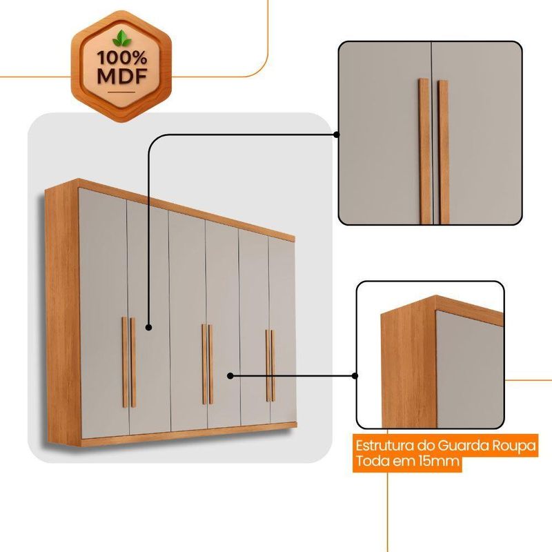 Guarda Roupa Casal Maya 6 Portas E 6 Gavetas Rufato Naturalle/off WhiteGuarda Roupa Casal Maya 100 MDF 6 Portas e 6 Gavetas - RufatoO Guarda-Roupa Maya combina beleza e modernidade em um design que atende a todas as suas necessidades. Espacoso e funcional, ele conta com corredicas telescopicas, puxadores de madeira, reforco de fundo nas gavetas, alem de calceiro e cabideiro em aluminio. Sua estrutura, feita em 100MDF garante durabilidade e robustez. Com compartimentos ideais para organizar roupas, sapatos e acessorios, este roupeiro e a peca que faltava para completar seu dormitorio com estilo e praticidade! Caracteristicas: Material da Estrutura: 100MDF Tipo de Acabamento: Pintura UV Material das Corredicas: Telescopica Material dos Cabideiros: Aluminio Dimensoes do Roupeiro: Altura: 235 cm Largura: 273 cm Profundidade: 56 cm Garantia do Fornecedor: 03 meses. Informacoes Importantes: As tonalidades das cores podem sofrer alteracao de acordo com a configuracao de cada monitor. Os objetos que ambientam as fotos nao acompanham o produto. Nao disponibilizamos a montagem do produto. Nao nos responsabilizamos por danos no produto causado por montagem. Verifique as dimensoes do produto e certifique-se que o percurso que ele fara ate o local de uso permite sua passagem. Para mais informacoes confira as politicas de entrega do site. Favor verificar o produto no ato da entrega e em caso de problemas decorrentes no transporte (arranhados, quebra, batida, amassados) deve-se efetuar a ressalva na nota fiscal para conhecimento da transportadora e comunicar imediatamente a loja. Moderna Mobilia reserva o direito de alterar as especificacoes tecnicas sem previo aviso. As medidas contidas no site podem sofrer variacoes de acordo com a montagem, tipo de costura etc.