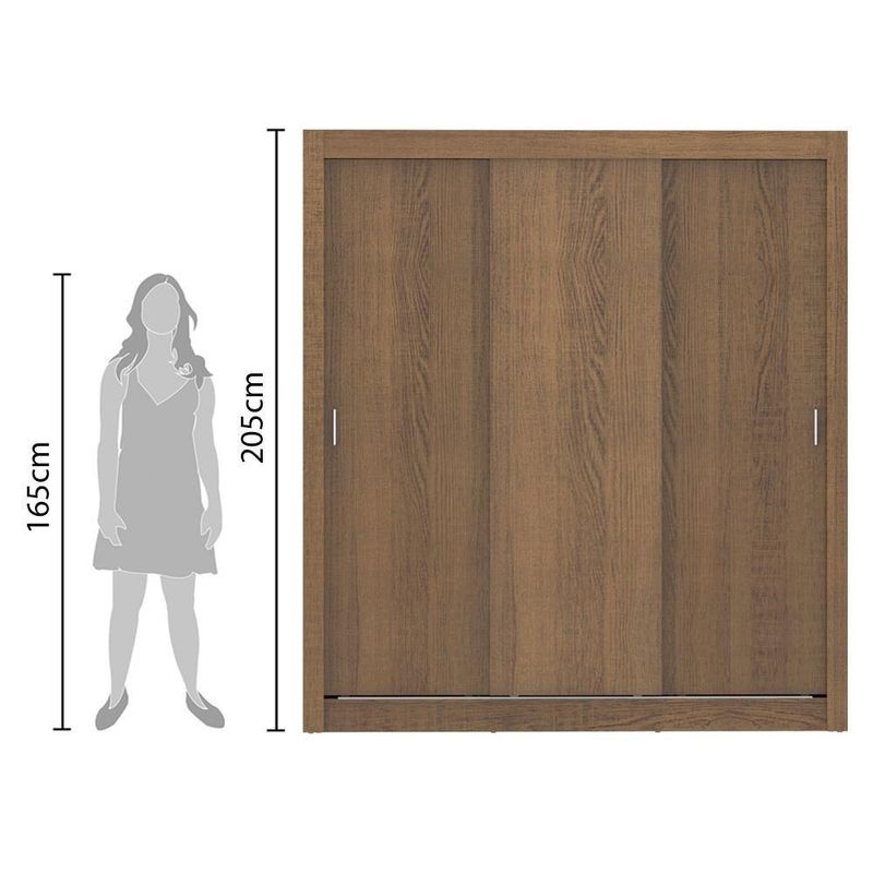 Guarda-Roupa Casal Mônaco 3 Portas de Correr Rustic MadesaO Guarda-Roupa de casal com melhor custo benefício do mercado.Características do Produto:- Ferragens de qualidade, três portas, cabideiro metálico e pintura em Poliéster Protetor, que confere durabilidade e resistência.- As portas de correr possuem trilho superior e inferior em alumínio e sistema de deslizamento suave, garantindo melhor funcionamento.- Total aproveitamento interno, pensado para o uso de duas pessoas.- São muitos nichos que facilitam a organização de roupas, calçados e acessórios.- O tubo cabideiro é muito resistente e possui espaço para roupas longas.- Os acabamentos interno e externo são em pintura Poliéster de alta resistência, que confere maior durabilidade ao produto.- A pintura é ecológica, isenta de gases que vão para a atmosfera.Especificações Técnicas:- Marca: Madesa- Dimensões do Produto (LxAxP): 170 cm X 205 cm X 46 cm- Dimensões da Embalagem (LxAxP): 55 cm X 17,5 cm X 213,5 cm- Peso da Embalagem: 79,8 kg- Estrutura: 3 Prateleiras Totalizando 7 Nichos; 3 Portas de Correr de Madeira; 1 Cabideiro Grande- Cor: Rustic- Referência: 10935ZGarantia: 3 meses