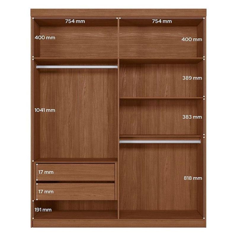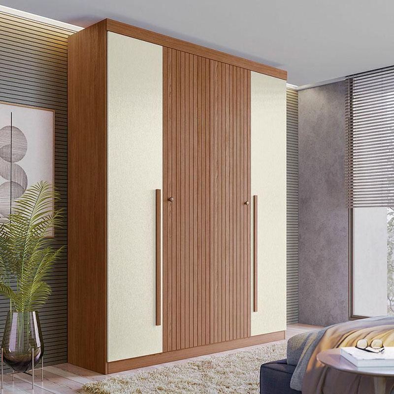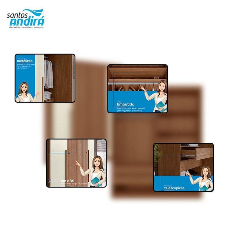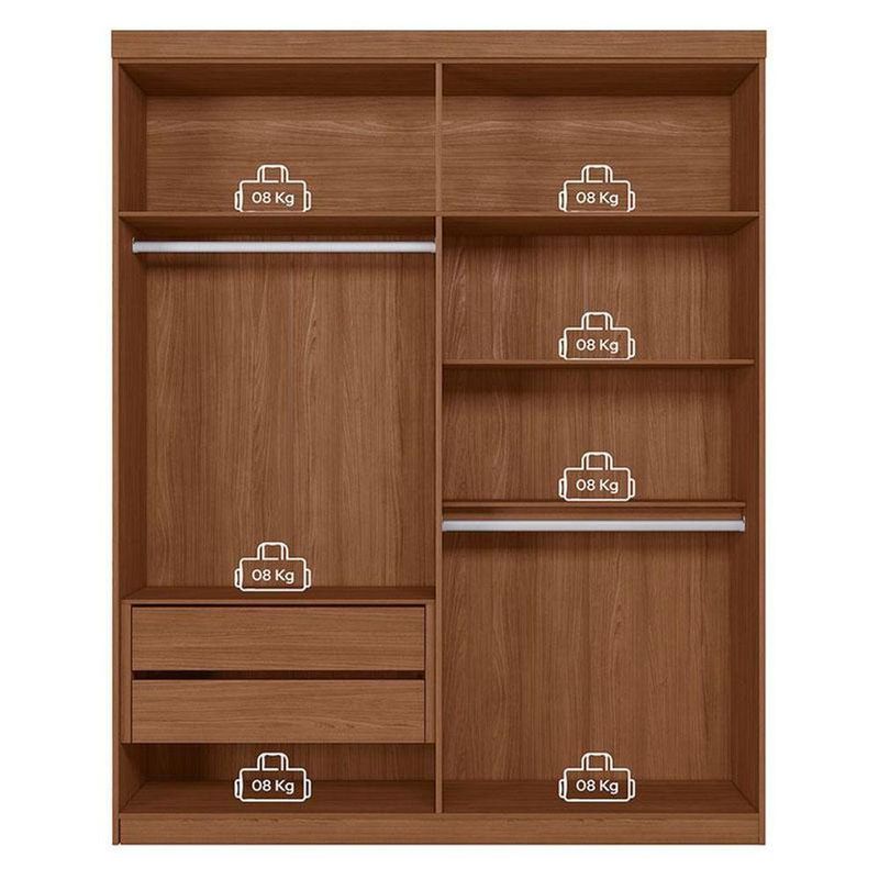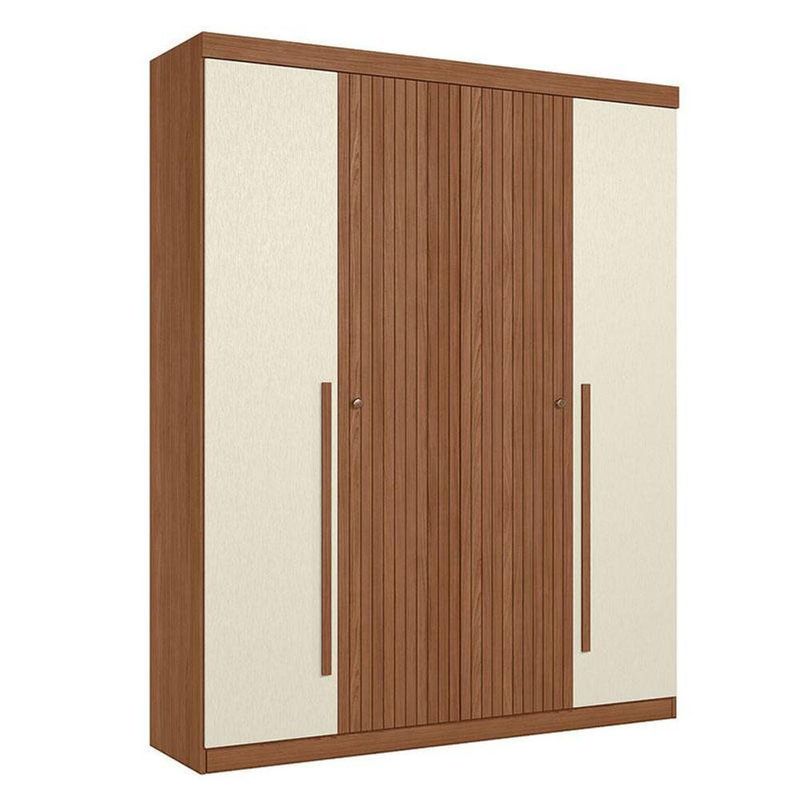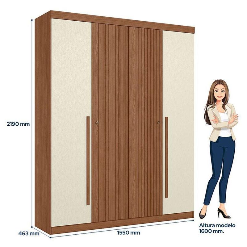 Guarda Roupa Casal Ripado 4 Portas Buriti Jatobá Areia Acetinado - Santos AndiráGuarda Roupa Casal Ripado 4 portas Buriti Jatobá Areia Acetinado - Santos AndiráGuarda Roupa Casal Ripado 4 portas Buriti Jatobá Areia: O Ripado Buriti 4 portas é para quem quer um guarda-roupa com presença e organização. Com portas ripadas, prateleiras amplas, gavetas resistentes e cabideiros de qualidade, ele guarda tudo com estilo. Acabamento suave ao toque e produção sustentável fazem dele uma escolha confiável.Características técnicas:- Desenvolvido em MDP/MDF- Pintura em Reverse Semi-Fosco- Duas gavetas com corrediças telescópicas- Dois puxadores em ABS e dois em MDF- Dois cabideiros em alumínio- 02 Amplos maleiros- 05 Prateleiras- 04 Portas com dobradiças metálicas- Espaço para sapatosDimensões:Altura: 219 cmLargura: 155 cmProfundidade: 46,3 cmInformações importantes:* Não acompanha decorações e acessórios* Nossas cargas possuem seguro, portanto, no ato da entrega, confira a quantidade de volumes recebida, e também o estado da embalagem. Se houver qualquer inconsistência, não assine o comprovante de entrega;* O armazenamento do produto no endereço de entrega é de responsabilidade do comprador. Evite apoiar o produto na vertical, bem como evite áreas que deixem o produto exposto a chuva ou umidade excessiva;* Pequenas variações de tonalidade são possíveis, em razão da diferença de resolução da tela onde o anúncio está sendo visualizado. Se notar diferença expressiva, comunicar a empresa antes de efetuar a montagem;* O serviço de entrega contratado contempla a entrega até a primeira área coberta ou portaria, não sendo coberto o ato de subir escadas/elevadores ou adentrar nas residências;* Não nos responsabilizamos pela montagem, desmontagem ou instalação do produto.