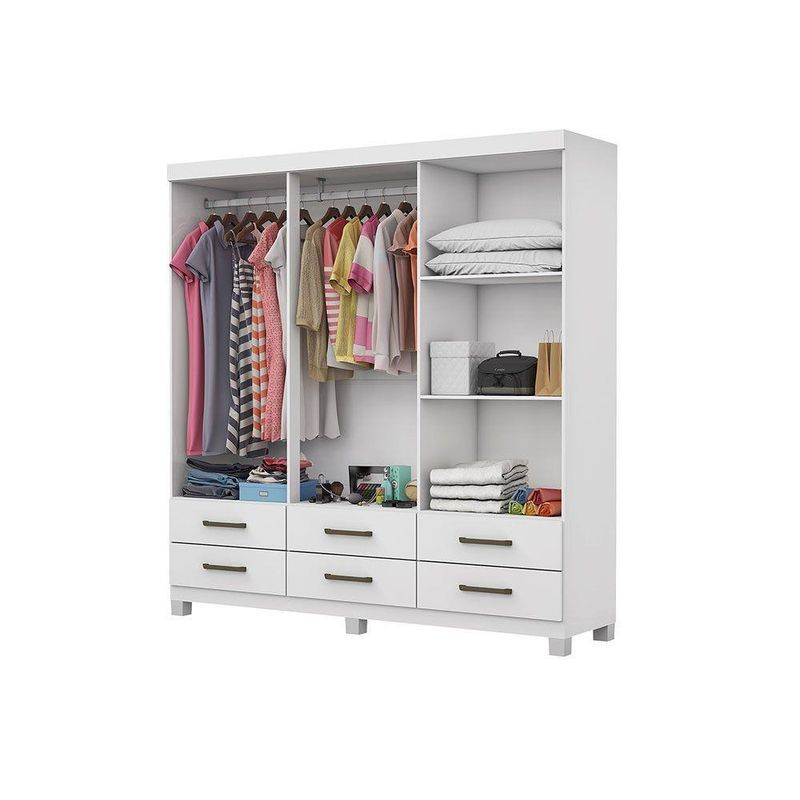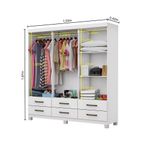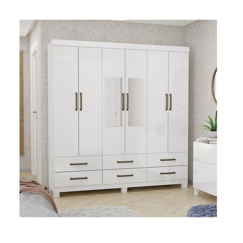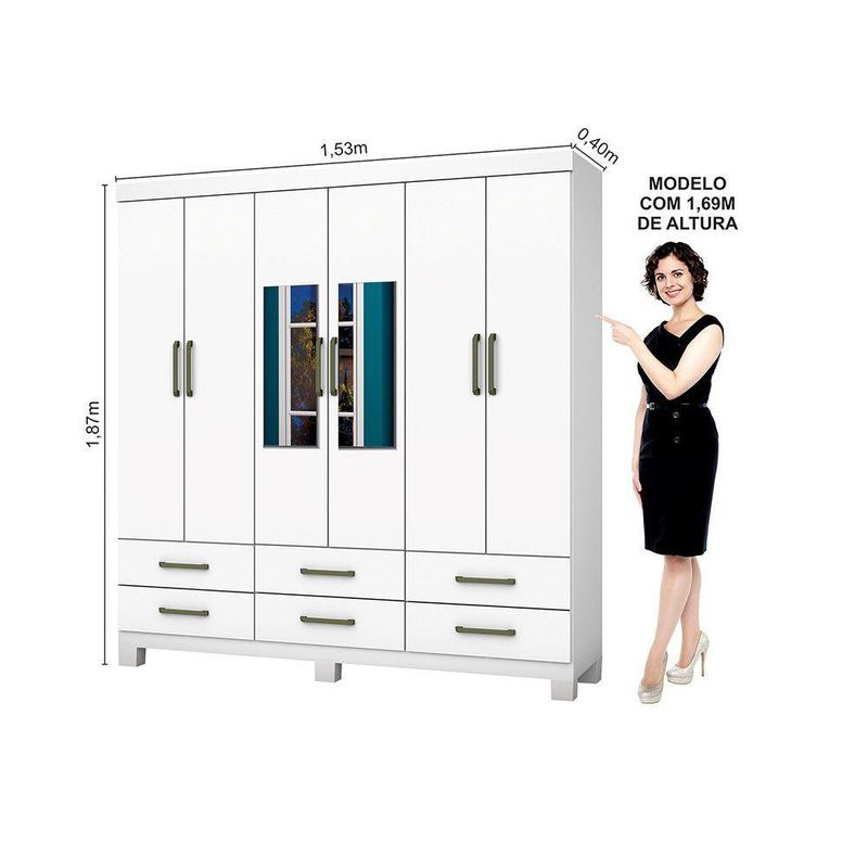Guarda-roupa D22 6 Portas 6 Gavetas Com Espelho E Pés BrancoGuarda-Roupa D22 é um produto perfeito para quem possui um ambiente com espaço reduzido e ainda procura qualidade e durabilidade no mesmo móveis. Possui 1,87m de altura, 1,53m de largura e 0,40m de profundidade combinado com 6 portas, 6 gavetas, 3 prateleiras e um grande cabideiro, deixando o produto com uma ótima divisão interna. O maleiro é ideal para guardar malas, cobertores, edredons. O cabideiro além de resistente, é ideal para pendurar pares de blusas, camisas acessórios.As prateleiras são perfeitas para colocar roupas como blusas, shorts, regatas, kits de maquiagem, toalhas, caixinhas com acessórios e bolsas menores. As gavetasfixadas sobre corrediças metálicas, são ideais para guardas blusas dobradas, shorts, malhas e roupas íntimas. Estrutura do produto em MDP.Dimensões do produto:Altura: 187cmLargura: 175cmProfundidade: 40cmPeso: 72,15kgGarantia do fornecedor: 03 meses.Cor: Branco