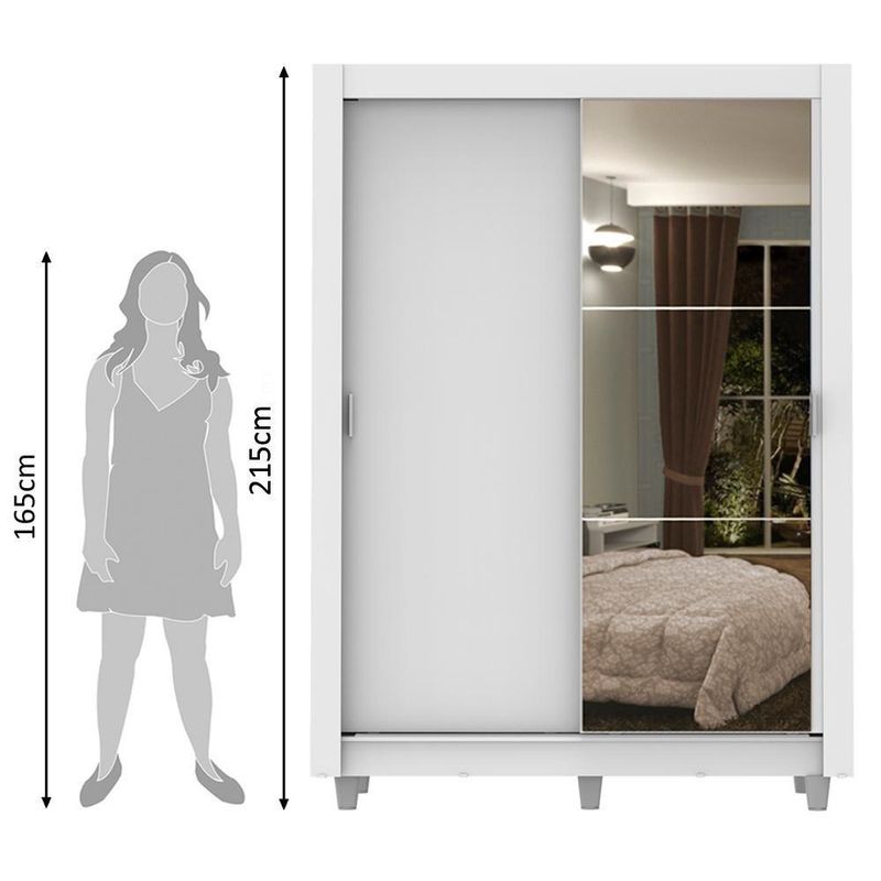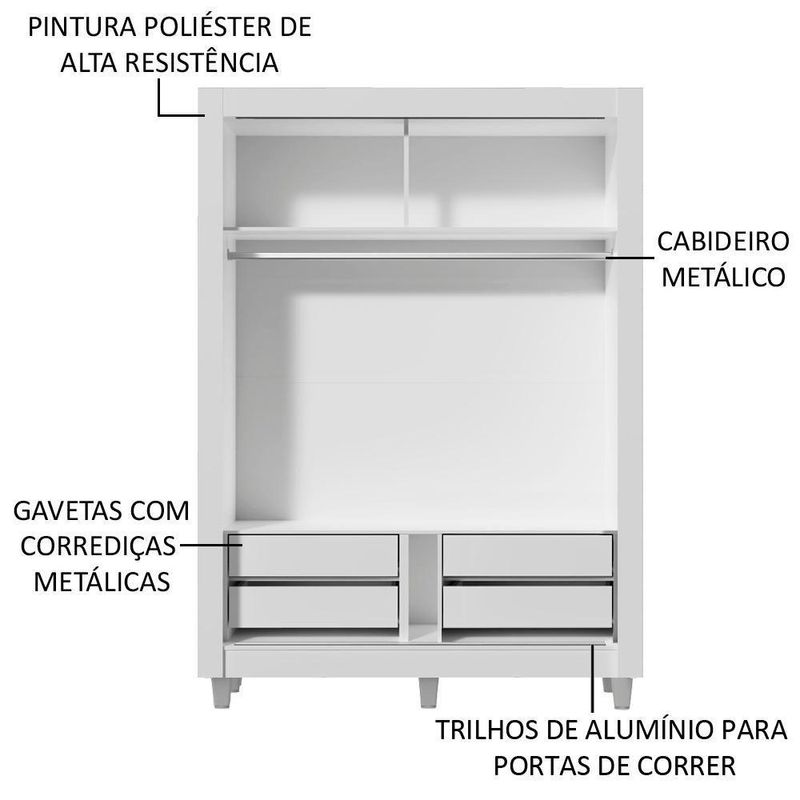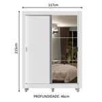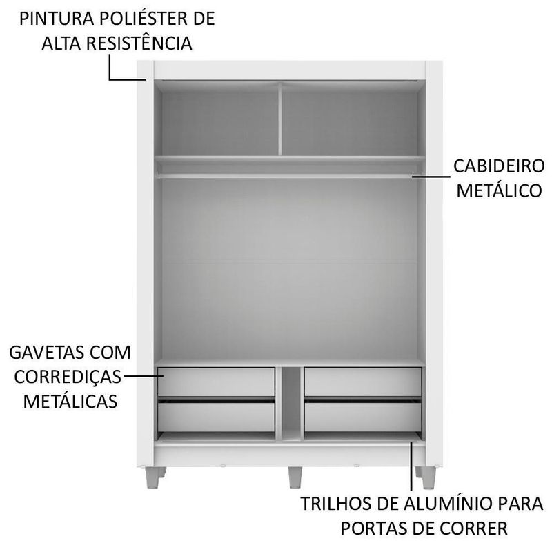 Guarda-Roupa Dallas Plus 2 Portas Correr 1 Espelho MadesaCaracterísticas do Produto:- Guarda-roupa com duas portas de correr de deslizamento suave.- Trilhos em alumínio, dobradiças metálicas e ferragens de qualidade que proporcionam melhor sustentação ao móvel.- Contempla quatro gavetas com corrediças metálicas, duas prateleiras e três nichos.- Cabideiro resistente e de tamanho diferenciado.- Pensado na medida certa para quarto de solteiro.- Possui acabamento em Pintura Poliéster de alta resistência que confere maior qualidade e durabilidade ao produto.- Possui pés reguláveis em PVC que conferem beleza e uma melhor sustentação.Especificações Técnicas:- Marca: Madesa- Modelo: Dallas Plus- Cor: Branco- Espelhos: 1- Portas: 2 de Correr- Gavetas: 4 Internas- Nichos: 3 Internos- Prateleiras: 2 Internas- Cabideiros: 1 de 105 cm- Pés: 6 Reguláveis em PVC- Corrediças: Metálicas- Acabamento: Pintura Poliéster- Dimensões do Produto (LxAxP): 117 cm X 215 cm X 46 cm- Dimensões da Embalagem (LxAxP): 55 cm X 45 cm X 218,5 cm- Peso Bruto: 73,4 kg- Referência: 1094091E4GCPGarantia: 3 meses