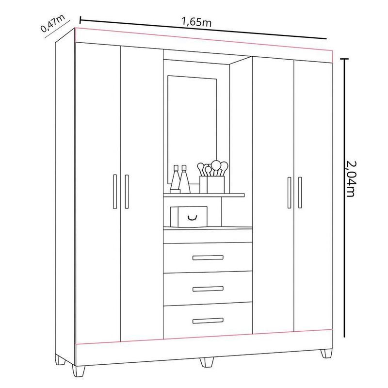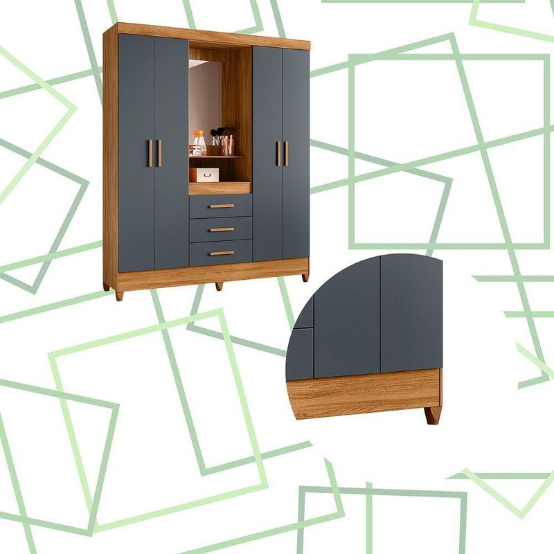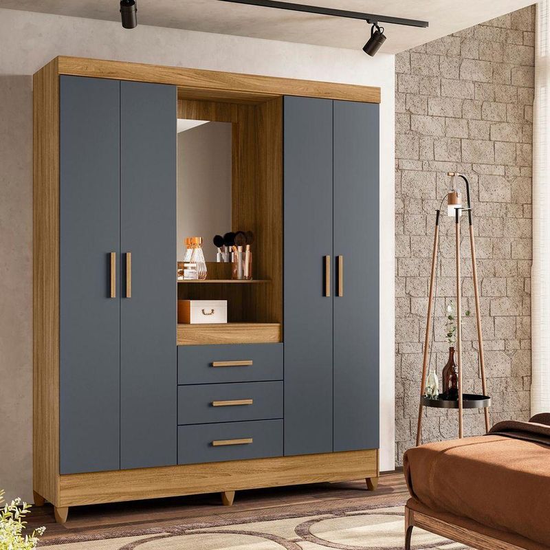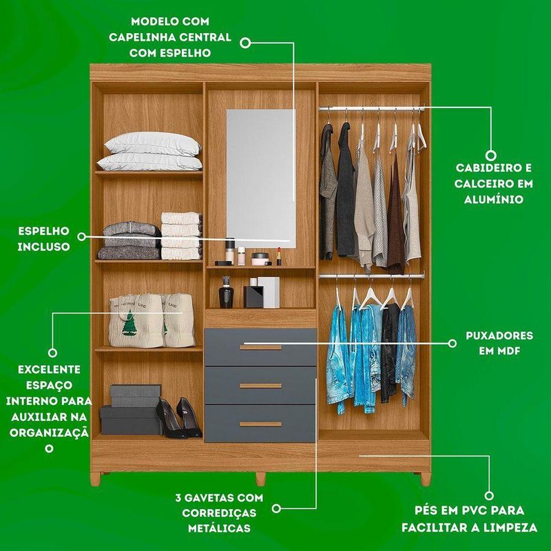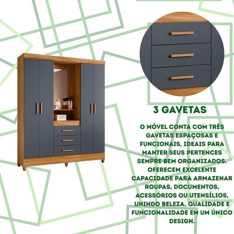 Guarda Roupa Grande Quarto Capri 4 Portas 3 Gavetas Espelho Freijo Com CinzaCom design moderno e estrutura funcional, o Guarda-Roupa Capri é perfeito para quem busca praticidade e estilo em um único móvel. Seu formato com 4 portas de giro e 3 gavetas oferece amplo espaço para roupas, calçados e acessórios, garantindo organização e conforto no dia a dia.O modelo faz parte da linha Smart, combinando elegância e durabilidade. As gavetas com corrediças metálicas proporcionam deslizamento suave, enquanto os cabideiros e calceiros em alumínio garantem resistência. Os puxadores em MDF e os pés em PVC completam o conjunto, oferecendo acabamento refinado e facilidade de limpeza.Dimensões:Altura: 204 cmLargura: 165 cmProfundidade: 47 cmDiferenciais:- 4 portas de giro com ótimo aproveitamento interno- 3 gavetas amplas com corrediças metálicas resistentes- Cabideiro e calceiro em alumínio para melhor organização- Puxadores em MDF, com toque moderno e ergonômico- Pés em PVC que facilitam a limpeza e protegem o móvel da umidade- Estrutura robusta e compacta, ideal para diversos tipos de quarto- Design da linha Smart, unindo praticidade e elegância