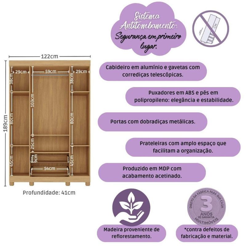 Guarda-roupa Infantil 122cm 4 Portas E 2 Gavetas Allegra Multimóveis Mp4443 Madeirado MadeiradoCriado para acompanhar os primeiros capítulos da infância, o Guarda-roupa Infantil 122cm 4 Portas e 2 Gavetas Allegra Multimóveis MP4443 une charme, organização e aquele sentimento de carinho que todo quarto infantil precisa. Um móvel que acolhe, decora e simplifica — tudo no mesmo lugar.Diferenciais:- 3 anos de garantia contra defeitos de fabricação e material.- Produzido em madeira de reflorestamento (MDP 12/15mm) com acabamento acetinado (cerca de 20% de brilho): sustentabilidade e durabilidade.- 4 portas e 2 gavetas: amplo espaço interno para organizar roupinhas e acessórios.- Corrediças telescópicas: permitem a abertura total e o manuseio silencioso das gavetas.- Cabideiro em alumínio: acomoda roupas longas e curtas para que não amassem.- Puxadores em ABS redondos e práticos.- Pés em polipropileno e rodapé: estabilidade e elegância.- Sistema antitombamento: proporciona segurança para o filho e tranquilidade aos pais.Conteúdo da Embalagem:1 (um) Guarda-roupaManual de MontagemKit FerragemDimensões do Produto Montado:Altura: 189cm | Largura: 122cm | Profundidade: 41cmAltura dos Pés: 5,8cm*Você pode consultar as medidas detalhadas na imagem técnica do produto.Observações Importantes:*As cores do produto podem sofrer variações de tonalidade de acordo com as configurações do seu dispositivo.*Aqui na Loja Multimóveis, você pode concluir sua compra facilmente com toda segurança. A entrega é garantida e você está em 1° lugar.*Imagens meramente ilustrativas (decoração não inclusa).*O produto será entregue desmontado e não disponibilizamos o serviço de montagem. Acabamento: FF/Pintura UV | Material: MDP | Referência do Modelo: MP4443 | Instruções de Cuidado: Limpar com pano seco para retirar o pó. Não utilizar produtos químicos ou abrasivos a limpeza. Não aplicar lustra móveis. | Coleção: Allegra | Sistema de Montagem: O produto acompanha manual de montagem juntamente com kit ferragem. O produto será entregue desmontado e não disponibilizamos o serviço de montagem. | Com Portas: Sim | Quantidade de Portas: 4 | Quantidade de Prateleiras: 6 | Corrediça: Telescópica | Quantidade de Gavetas: 2 | Material do Puxador: ABS | Altura Montado: 189 | Largura Montado: 122 | Profundidade Montado: 41 | Tamanho (L x A x P): 122 x 189 x 41 | Tonalidade: Branco | Produto: Guarda Roupa | Peso do Produto: 72 | Garantia do Fabricante: 3 | Tipo de Guarda-Roupa: Infantil | Fabricante: Multimóveis | Requer Montagem: Sim | Tamanho de Guarda-Roupa: Solteiro | Tipos de abertura das portas: Porta de dobradiça | Altura (cm): 189 cm | Largura (cm): 122 cm | Profundidade (cm): 41 cm | Estado de Origem: RS | Com prateleiras: Sim | Com gavetas: Sim | Com nichos: Não | Com baú: Não | Com cabideiros: Sim | Quantidade de nichos: 0 | Com espaço para calçado: Não | Com corrediças telescópicas: Sim | Tempo de Garantia: 3 meses | Produto Composto por: 1 guarda-roupa, manual de montagem e kit ferragem. | Destaque 1: Produzido em MDP: maior durabilidade e resistência. | Destaque 2: Cabideiro de alumínio para organizar roupas longas e curtas. | Destaque 3: Gavetas com corrediças telescópicas: abertura total e silenciosa. | Destaque 4: Tamanho do produto montado (L x A x P): 122 x 189 x 41 cm | Destaque 5: Pés em polipropileno e rodapés: estabilidade e elegância. | Tipo de produto: Guarda-roupa | Capacidade em peso: N/A | Tempo de montagem: N/A | Estilo: Moderno | Marca: Multimóveis | Com pés: Sim | Com espelho: Não | Peso (kg): 72 kg | Quantidade de caixas de embalagem: 03 | Baterias são necessárias?: Não | Certificação de teste externa: N/A | Is Fragile: Não | Dimensões do item P x L x A: depth#value=41;depth#unit=centimeters;width#value=122;width#unit=centimeters;height#value=189;height#unit=centimeters | Quantidade de itens: 1 | Número da peça: MP4443.697 | Peso do item: unit=kilograms;value=72 | Inclui manual de montagem: Sim | Materiais da estrutura: MDP | Tipo de Garantia: Garantia do Fabricante | Montagem: Necessita Montagem | País de Origem: Brasil | Componentes incluídos: Kit de instalação | Altura do Produto com Embalagem: 25 cm | Largura do Produto com Embalagem: 43 cm | Comprimento do Produto com Embalagem: 188 cm | Tipo da embalagem do vendor: Sem embalagem adicional | Peso do Produto com Embalagem: 72000 g | Cor: Madeirado
