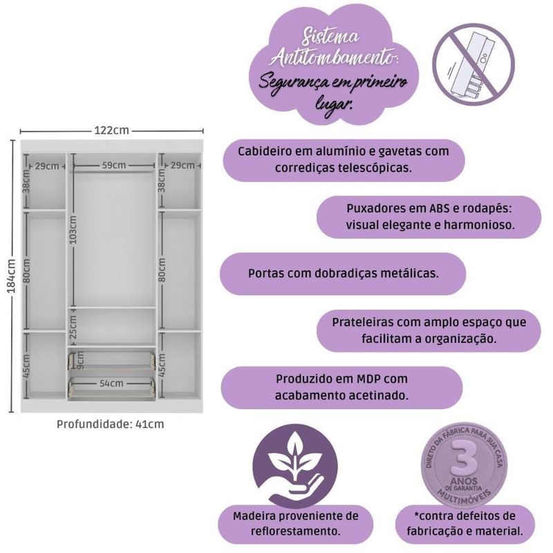Guarda-roupa Infantil 122cm 4 Portas E 2 Gavetas Encanto Multimóveis Mp4448 Branco/madeirado Branco/madeiradoCriado para acompanhar os primeiros capítulos da infância, o Guarda-roupa Infantil 122cm 4 Portas e 2 Gavetas Encanto Multimóveis MP4448 une charme, organização e aquele sentimento de carinho que todo quarto infantil precisa. Um móvel que acolhe, decora e simplifica — tudo no mesmo lugar.Diferenciais:- 3 anos de garantia contra defeitos de fabricação e material.- Produzido em madeira de reflorestamento (MDP 12/15mm) com acabamento acetinado (cerca de 20% de brilho): sustentabilidade e durabilidade.- 4 portas e 2 gavetas: amplo espaço interno para organizar roupinhas e acessórios.- Corrediças telescópicas: permitem a abertura total e o manuseio silencioso das gavetas.- Cabideiro em alumínio: acomoda roupas longas e curtas para que não amassem.- Puxadores em ABS redondos e práticos.- Rodapé: visual harmonioso e facilidade na limpeza do ambiente.- Sistema antitombamento: proporciona segurança para o filho e tranquilidade aos pais.Conteúdo da Embalagem:1 (um) Guarda-roupaManual de MontagemKit FerragemDimensões do Produto Montado:Altura: 184cm | Largura: 122cm | Profundidade: 41cm*Você pode consultar as medidas detalhadas na imagem técnica do produto.Observações Importantes:*As cores do produto podem sofrer variações de tonalidade de acordo com as configurações do seu dispositivo.*Aqui na Loja Multimóveis, você pode concluir sua compra facilmente com toda segurança. A entrega é garantida e você está em 1° lugar.*Imagens meramente ilustrativas (decoração não inclusa).*O produto será entregue desmontado e não disponibilizamos o serviço de montagem. Acabamento: FF/Pintura UV | Material: MDP | Referência do Modelo: MP4448 | Instruções de Cuidado: Limpar com pano seco para retirar o pó. Não utilizar produtos químicos ou abrasivos a limpeza. Não aplicar lustra móveis. | Coleção: Encanto | Sistema de Montagem: O produto acompanha manual de montagem juntamente com kit ferragem. O produto será entregue desmontado e não disponibilizamos o serviço de montagem. | Com Portas: Sim | Quantidade de Portas: 4 | Quantidade de Prateleiras: 6 | Corrediça: Telescópica | Quantidade de Gavetas: 2 | Material do Puxador: ABS | Altura Montado: 184 | Largura Montado: 122 | Profundidade Montado: 41 | Tamanho (L x A x P): 122 x 184 x 41 | Tonalidade: Branco | Produto: Guarda Roupa | Peso do Produto: 72 | Garantia do Fabricante: 3 | Tipo de Guarda-Roupa: Infantil | Fabricante: Multimóveis | Requer Montagem: Sim | Tamanho de Guarda-Roupa: Solteiro | Tipos de abertura das portas: Porta de dobradiça | Altura (cm): 184 cm | Largura (cm): 122 cm | Profundidade (cm): 41 cm | Estado de Origem: RS | Com prateleiras: Sim | Com gavetas: Sim | Com nichos: Não | Com baú: Não | Com cabideiros: Sim | Quantidade de nichos: 0 | Com espaço para calçado: Não | Com corrediças telescópicas: Sim | Tempo de Garantia: 3 meses | Produto Composto por: 1 guarda-roupa, manual de montagem e kit ferragem. | Destaque 1: Produzido em MDP: maior durabilidade e resistência. | Destaque 2: Cabideiro de alumínio para organizar roupas longas e curtas. | Destaque 3: Gavetas com corrediças telescópicas: abertura total e silenciosa. | Destaque 4: Tamanho do produto montado (L x A x P): 122 x 184 x 41 cm | Destaque 5: Rodapés: visual elegante e harmonioso. | Tipo de produto: Guarda-roupa | Capacidade em peso: N/A | Tempo de montagem: N/A | Estilo: Moderno | Marca: Multimóveis | Com pés: Não | Com espelho: Não | Peso (kg): 72 kg | Quantidade de caixas de embalagem: 03 | Baterias são necessárias?: Não | Certificação de teste externa: N/A | Is Fragile: Não | Dimensões do item P x L x A: depth#value=41;depth#unit=centimeters;width#value=122;width#unit=centimeters;height#value=184;height#unit=centimeters | Quantidade de itens: 1 | Número da peça: MP4448.697 | Peso do item: unit=kilograms;value=72 | Inclui manual de montagem: Sim | Materiais da estrutura: MDP | Tipo de Garantia: Garantia do Fabricante | Montagem: Necessita Montagem | País de Origem: Brasil | Componentes incluídos: Kit de instalação | Altura do Produto com Embalagem: 25 cm | Largura do Produto com Embalagem: 43 cm | Comprimento do Produto com Embalagem: 188 cm | Tipo da embalagem do vendor: Sem embalagem adicional | Peso do Produto com Embalagem: 72000 g | Cor: Branco/Madeirado
