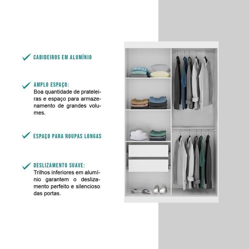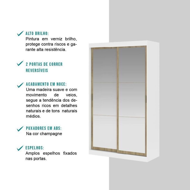 Guarda Roupa Infantil 2 Portas 2 Gav Espelho Branco Carraro NeroO Guarda-Roupa Nero Carraro é uma peça ótima para organizar e manter seu ambiente estilo. Conta com espelho nas duas portas e ainda são reversíveis, podendo escolher o melhor acabamento na hora da montagem. Ele comporta tudo que precisa sem ;a preocupação de falta de espaço. A peça possui grande espeaço de ;cabideiros e gavetas, nichos ;laterais ;com diversas prateleiras internas, é possível armazenar roupas, acessórios e calçados, deixando tudo à mão e trazendo muita praticidade para o seu dia a dia.Especificações do Produto:Medidas Totais: Largura: 120 cm | Altura: 206 cm | Profundidade: 50 cmPeso: ;92,8 KgMatéria Prima: ;MDP 12 e 15mmPortas: 2 portas de correrSistema Abertura: Rolamentos | Puxador: ABSEspelhos: SimGavetas: 2 internas | Corrediças: MetálicasCabideiro: 2 (alumínio) | Prateleiras: 4 (internas)Montagem: Minifix e ParafGarantia:Possuí ;garantia de 03 meses (se em condições normais), contra defeito de fabricação, ou componentes utilizados.Esta garantia não cobre defeitos por inadequado ou abusivo, falta de cuidados e desbotamento dos revestimentos.Condições de perda da garantia:- Mau ou manuseio incorreto.- Desbotamento ca pela exposição direta da luz solar.- Danos cas por agentes da , como inundações ou acidentes de qualquer espécie.- indevido de produtos abrasivos para realizar a limpeza.- Decurso do prazo estabelecido. Altura (cm): 206,0 cm | Espelho: Com Espelho | Cor: Branco | Tipo de Porta: Correr | Dimensões: Entre 2.000 e 2.299 mm | Cor Via Varejo: Branco | Família da Cor: Branco | Material para Filtro: Madeira | Peso: 87 | Estado de Origem: RS | Tipo de Guarda Roupa: Solteiro | Largura do produto (cm): 120 cm | Profundidade (cm): 50 cm | Instruções/Cuidados: Nenhuma Informação | Peso do Produto com Embalagem (kg): 92,8 kg | Produto precisa de Montagem?: Sim, montagem e instalação do Painel | Altura do Produto com Embalagem (cm): 19,7 cm | Largura do Produto com Embalagem (cm): 61,8 cm | Comprimento do Produto com Embalagem (cm): 211 cm | Descrição do Tamanho: 19,7 cm x 61,8 cm x 211 cm | Conteúdo da Embalagem: 1 Guarda Roupa Infantil 2 Portas 2 Gav Espelho Branco Carraro Nero | Nome do Simples no Fornecedor: Guarda Roupa Infantil 2 Portas 2 Gav Espelho Branco Carraro Nero
