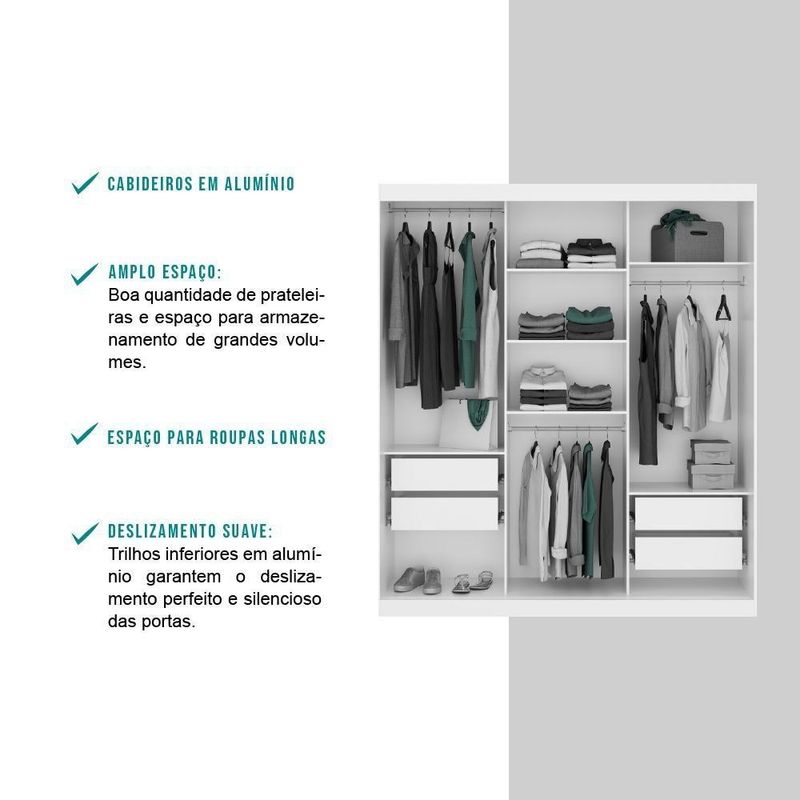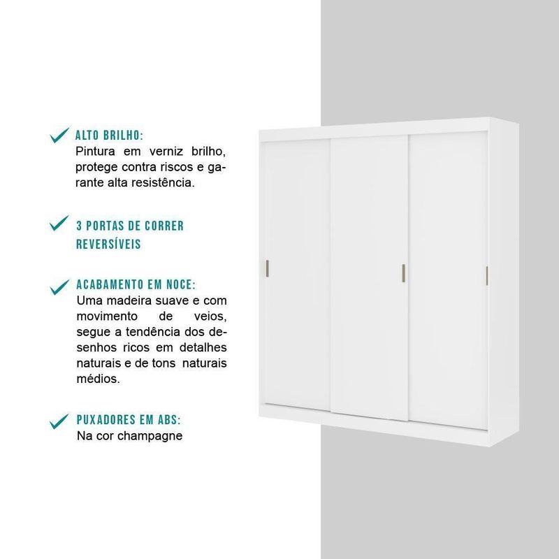 Guarda Roupa Infantil 3 Portas 4 Gav 3 Espelhos Branco Mega O Guarda-Roupa West Carraro é uma peça ótima para organizar e manter seu ambiente estilo. Conta com 3 portas reversíveis, podendo escolher o melhor acabamento na hora da . Ele comporta tudo que precisa sem a preocupação de falta de espaço. A peça possui grande espeaço de cabideiros e gavetas, nichos laterais com diversas prateleiras internas, é possível armazenar roupas, acessórios e calçados, deixando tudo à mão e trazendo muita praticidade para o seu dia a dia.Especificações do Produto:Medidas Totais: Largura: 180 cm | Altura: 206 cm | Profundidade: 50 cmPeso: 110,1 KgMatéria Prima: MDP 12 e 15mmPortas: 3 portas de correrSistema Abertura: Rolamentos | Puxador: ABSGavetas: 4 internas | Corrediças: MetálicasCabideiro: 3 (alumínio) | Prateleiras: 6 (internas): Minifix e ParafGarantia:Possuí garantia de 03 meses (se em condições normais), contra defeito de fabricação, ou componentes utilizados.Esta garantia não cobre defeitos por inadequado ou abusivo, falta de cuidados e desbotamento l dos revestimentos.Condições de perda da garantia:- Mau ou manuseio incorreto.- Desbotamento ca pela exposição direta da luz solar.- Danos cas por agentes da , como inundações ou acidentes de qualquer espécie.- indevido de produtos abrasivos para realizar a limpeza.- Decurso do prazo estabelecido.Recomendações para uma boa conservação:- Dicas para limpeza e conservação do seu produto, você encontrará no esquema de que o acompanha.Informações importantes:- Trabalhamos para apresentar imagens fiéis ao produto real. Porém, as cores podem sofrer variações de acordo com o monitor, iluminação do ambiente em que se encontram e até por sua percepção visual comparado ao ambiente residencial.- As imagens são meramente ilustrativas.- Objetos decorativos não acompanham o produto.- O produto é enviado desmontado.- Acompanha manual com instruções para a .- A Móveis Carraro não realiza o serviço de .PERGUNTAS FREQUENTES- Existem outras cores disponíveis?Sim, este produto possui outras cores disponíveis em outros anúncios.- Vocês m para todas as regiões do Brasil? De que forma é feita a ?Sim, mos para todas as regiões do Brasil. E a é realizada por s parceiras.- Este produto é novo ou ?Todos os s produtos são novos. Acompanham e certificado de garantia.- Recebo o produto montado?Não, este produto é enviado desmontado. Junto com ele é enviado manual com instruções para a .- Vocês realizam a do produto?Não possuímos o serviço de .PrazoExp: 3 | Altura (cm): 206,0 cm | Espelho: Sem Espelho | Cor: Branco | Tipo de Porta: Correr | Dimensões: Entre 2.000 e 2.299 mm | Cor Via Varejo: Branco | Família da Cor: Branco | Material para Filtro: Madeira | Peso: 110.1 | Estado de Origem: RS | Tipo de Guarda Roupa: Casal | Largura do produto (cm): 180 cm | Profundidade (cm): 50 cm | Nome do Simples no Fornecedor: Guarda Roupa Casal 3 Portas 4 Gav Branco Carraro | Quantidade de Portas: 3 | Conteúdo da Embalagem: 1 Guarda Roupa Casal 3 Portas 4 Gav Branco Carraro | Instruções/Cuidados: Nenhuma Informação | Peso do Produto com Embalagem (kg): 110,1 kg | Produto precisa de ?: Sim, e instalação do Painel | Altura do Produto com Embalagem (cm): 21,9 cm | Largura do Produto com Embalagem (cm): 61,8 cm | Comprimento do Produto com Embalagem (cm): 221,08 cm | Descrição do Tamanho: 21,9 cm x 61,8 cm x 221,08 cm