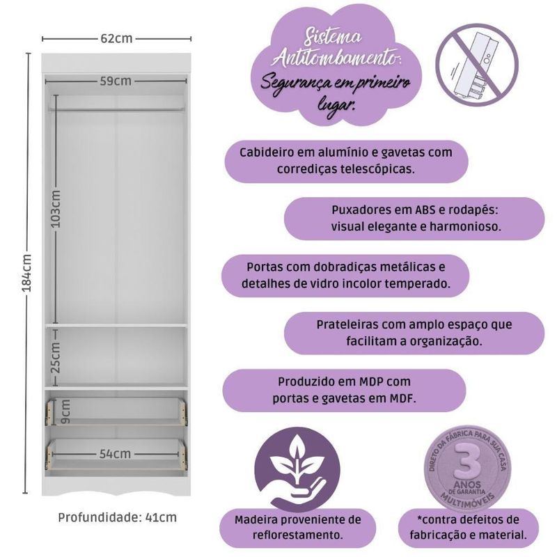 Guarda-roupa Infantil 62cm 2 Portas Com Vidro E 2 Gavetas Sonho Multimóveis MP4471 Branco/off WhiteDescubra como pequenos detalhes podem transformar o cantinho do seu bebê em um espaço cheio de encanto e praticidade. O Guarda-roupa Infantil 62cm 2 Portas com Vidro e 2 Gavetas Sonho Multimóveis MP4471 foi pensado para trazer leveza ao ambiente, deixando tudo mais delicado e organizado. Compacto por fora e surpreendente por dentro, ele oferece o aconchego visual e a funcionalidade que toda família busca. Uma escolha que traz tranquilidade para o dia a dia e beleza para o quarto.Diferenciais:- 3 anos de garantia contra defeitos de fabricação e material.- Produzido em madeira de reflorestamento (MDP 12/15mm) com acabamento acetinado (cerca de 20% de brilho): sustentabilidade e durabilidade.- 2 portas e 2 gavetas (frontais em MDF): amplo espaço interno para organizar roupinhas e acessórios.- Detalhes de vidro incolor temperado 3mm nas portas: toque charmoso que permite visualizar o interior do móvel.- Corrediças telescópicas: permitem a abertura total e o manuseio silencioso das gavetas.- Cabideiro em alumínio: acomoda roupas longas e curtas para que não amassem.- Puxadores em ABS redondos e práticos.- Rodapé usinado em MDF: visual harmonioso e elegante.- Sistema antitombamento: proporciona segurança para o filho e tranquilidade aos pais.Conteúdo da Embalagem:1 (um) Guarda-roupaManual de MontagemKit FerragemDimensões do Produto Montado:Altura: 184cm | Largura: 62cm | Profundidade: 41cm*Você pode consultar as medidas detalhadas na imagem técnica do produto.Observações Importantes:*As cores do produto podem sofrer variações de tonalidade de acordo com as configurações do seu dispositivo.*Aqui na Loja Multimóveis, você pode concluir sua compra facilmente com toda segurança. A entrega é garantida e você está em 1° lugar.*Imagens meramente ilustrativas (decoração não inclusa).*O produto será entregue desmontado e não disponibilizamos o serviço de montagem. Acabamento: FF/Pintura UV | Material: MDP/MDF | Referência do Modelo: MP4471 | Instruções de Cuidado: Limpar com pano seco para retirar o pó. Não utilizar produtos químicos ou abrasivos a limpeza. Não aplicar lustra móveis. | Coleção: Sonho | Sistema de Montagem: O produto acompanha manual de montagem juntamente com kit ferragem. O produto será entregue desmontado e não disponibilizamos o serviço de montagem. | Com Portas: Sim | Quantidade de Portas: 2 | Quantidade de Prateleiras: 2 | Corrediça: Telescópica | Quantidade de Gavetas: 2 | Material do Puxador: ABS | Altura Montado: 184 | Largura Montado: 62 | Profundidade Montado: 41 | Tamanho (L x A x P): 62 x 184 x 41 | Tonalidade: Branco | Produto: Guarda Roupa | Peso do Produto: 39 | Garantia do Fabricante: 3 | Tipo de Guarda-Roupa: Infantil | Fabricante: Multimóveis | Requer Montagem: Sim | Tamanho de Guarda-Roupa: Solteiro | Tipos de abertura das portas: Porta de dobradiça | Altura (cm): 184 cm | Largura (cm): 62 cm | Profundidade (cm): 41 cm | Estado de Origem: RS | Com prateleiras: Sim | Com gavetas: Sim | Com nichos: Não | Com baú: Não | Com cabideiros: Sim | Quantidade de nichos: 0 | Com espaço para calçado: Não | Com corrediças telescópicas: Sim | Tempo de Garantia: 3 meses | Produto Composto por: 1 guarda-roupa, manual de montagem e kit ferragem. | Destaque 1: Produzido em MDP/MDF: maior durabilidade e resistência. | Destaque 2: Cabideiro de alumínio para organizar roupas longas e curtas. | Destaque 3: Gavetas com corrediças telescópicas: abertura total e silenciosa. | Destaque 4: Tamanho do produto montado (L x A x P): 62 x 184 x 41 cm | Destaque 5: Detalhes de vidro incolor temperado nas portas: toque charmoso que permite visualizar o interior do móvel. | Tipo de produto: Guarda-roupa | Capacidade em peso: N/A | Tempo de montagem: N/A | Estilo: Moderno | Marca: Multimóveis | Com pés: Não | Com espelho: Não | Peso (kg): 39 kg | Quantidade de caixas de embalagem: 02 | Baterias são necessárias?: Não | Certificação de teste externa: N/A | Is Fragile: Sim | Dimensões do item P x L x A: depth#value=41;depth#unit=centimeters;width#value=62;width#unit=centimeters;height#value=184;height#unit=centimeters | Quantidade de itens: 1 | Número da peça: MP4471.499 | Peso do item: unit=kilograms;value=39 | Inclui manual de montagem: Sim | Materiais da estrutura: MDP | Tipo de Garantia: Garantia do Fabricante | Montagem: Necessita Montagem | País de Origem: Brasil | Componentes incluídos: Kit de instalação | Altura do Produto com Embalagem: 18 cm | Largura do Produto com Embalagem: 43 cm | Comprimento do Produto com Embalagem: 188 cm | Tipo da embalagem do vendor: Sem embalagem adicional | Peso do Produto com Embalagem: 39000 g | Cor: Branco/Off White