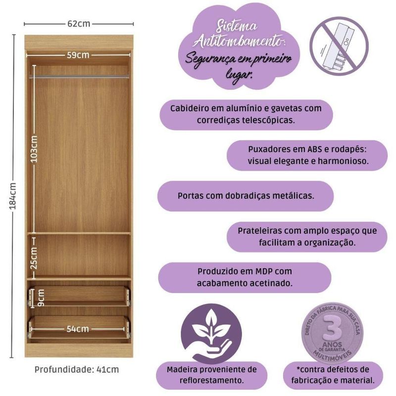 Guarda-roupa Infantil 62cm 2 Portas E 2 Gavetas Encanto Multimóveis Mp4446 Madeirado/branco Madeirado/brancoDescubra como pequenos detalhes podem transformar o cantinho do seu bebê em um espaço cheio de encanto e praticidade. O Guarda-roupa Infantil 62cm 2 Portas e 2 Gavetas Encanto Multimóveis MP4446 foi pensado para trazer leveza ao ambiente, deixando tudo mais delicado e organizado. Compacto por fora e surpreendente por dentro, ele oferece o aconchego visual e a funcionalidade que toda família busca. Uma escolha que traz tranquilidade para o dia a dia e beleza para o quarto.Diferenciais:- 3 anos de garantia contra defeitos de fabricação e material.- Produzido em madeira de reflorestamento (MDP 12/15mm) com acabamento acetinado (cerca de 20% de brilho): sustentabilidade e durabilidade.- 2 portas e 2 gavetas: amplo espaço interno para organizar roupinhas e acessórios.- Corrediças telescópicas: permitem a abertura total e o manuseio silencioso das gavetas.- Cabideiro em alumínio: acomoda roupas longas e curtas para que não amassem.- Puxadores em ABS redondos e práticos.- Rodapé: visual harmonioso e facilidade na limpeza do ambiente.- Sistema antitombamento: proporciona segurança para o filho e tranquilidade aos pais.Conteúdo da Embalagem:1 (um) Guarda-roupaManual de MontagemKit FerragemDimensões do Produto Montado:Altura: 184cm | Largura: 62cm | Profundidade: 41cm*Você pode consultar as medidas detalhadas na imagem técnica do produto.Observações Importantes:*As cores do produto podem sofrer variações de tonalidade de acordo com as configurações do seu dispositivo.*Aqui na Loja Multimóveis, você pode concluir sua compra facilmente com toda segurança. A entrega é garantida e você está em 1° lugar.*Imagens meramente ilustrativas (decoração não inclusa).*O produto será entregue desmontado e não disponibilizamos o serviço de montagem. Acabamento: FF/Pintura UV | Material: MDP | Referência do Modelo: MP4446 | Instruções de Cuidado: Limpar com pano seco para retirar o pó. Não utilizar produtos químicos ou abrasivos a limpeza. Não aplicar lustra móveis. | Coleção: Encanto | Sistema de Montagem: O produto acompanha manual de montagem juntamente com kit ferragem. O produto será entregue desmontado e não disponibilizamos o serviço de montagem. | Com Portas: Sim | Quantidade de Portas: 2 | Quantidade de Prateleiras: 2 | Corrediça: Telescópica | Quantidade de Gavetas: 2 | Material do Puxador: ABS | Altura Montado: 184 | Largura Montado: 62 | Profundidade Montado: 41 | Tamanho (L x A x P): 62 x 184 x 41 | Tonalidade: Branco | Produto: Guarda Roupa | Peso do Produto: 39 | Garantia do Fabricante: 3 | Tipo de Guarda-Roupa: Infantil | Fabricante: Multimóveis | Requer Montagem: Sim | Tamanho de Guarda-Roupa: Solteiro | Tipos de abertura das portas: Porta de dobradiça | Altura (cm): 184 cm | Largura (cm): 62 cm | Profundidade (cm): 41 cm | Estado de Origem: RS | Com prateleiras: Sim | Com gavetas: Sim | Com nichos: Não | Com baú: Não | Com cabideiros: Sim | Quantidade de nichos: 0 | Com espaço para calçado: Não | Com corrediças telescópicas: Sim | Tempo de Garantia: 3 meses | Produto Composto por: 1 guarda-roupa, manual de montagem e kit ferragem. | Destaque 1: Produzido em MDP: maior durabilidade e resistência. | Destaque 2: Cabideiro de alumínio para organizar roupas longas e curtas. | Destaque 3: Gavetas com corrediças telescópicas: abertura total e silenciosa. | Destaque 4: Tamanho do produto montado (L x A x P): 62 x 184 x 41 cm | Destaque 5: Rodapés: visual elegante e harmonioso. | Tipo de produto: Guarda-roupa | Capacidade em peso: N/A | Tempo de montagem: N/A | Estilo: Moderno | Marca: Multimóveis | Com pés: Não | Com espelho: Não | Peso (kg): 39 kg | Quantidade de caixas de embalagem: 02 | Baterias são necessárias?: Não | Certificação de teste externa: N/A | Is Fragile: Não | Dimensões do item P x L x A: depth#value=41;depth#unit=centimeters;width#value=62;width#unit=centimeters;height#value=184;height#unit=centimeters | Quantidade de itens: 1 | Número da peça: MP4446.697 | Peso do item: unit=kilograms;value=39 | Inclui manual de montagem: Sim | Materiais da estrutura: MDP | Tipo de Garantia: Garantia do Fabricante | Montagem: Necessita Montagem | País de Origem: Brasil | Componentes incluídos: Kit de instalação | Altura do Produto com Embalagem: 18 cm | Largura do Produto com Embalagem: 43 cm | Comprimento do Produto com Embalagem: 188 cm | Tipo da embalagem do vendor: Sem embalagem adicional | Peso do Produto com Embalagem: 39000 g | Cor: Madeirado/Branco