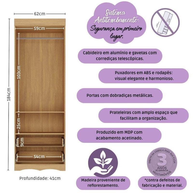 Guarda-roupa Infantil 62cm 2 Portas E 2 Gavetas Realeza Multimóveis Mp4451 Madeirado/branco Madeirado/brancoDescubra como pequenos detalhes podem transformar o cantinho do seu bebê em um espaço cheio de encanto e praticidade. O Guarda-roupa Infantil 62cm 2 Portas e 2 Gavetas Realeza Multimóveis MP4451 foi pensado para trazer leveza ao ambiente, deixando tudo mais delicado e organizado. Compacto por fora e surpreendente por dentro, ele oferece o aconchego visual e a funcionalidade que toda família busca. Uma escolha que traz tranquilidade para o dia a dia e beleza para o quarto.Diferenciais:- 3 anos de garantia contra defeitos de fabricação e material.- Produzido em madeira de reflorestamento (MDP 12/15mm) com acabamento acetinado (cerca de 20% de brilho): sustentabilidade e durabilidade.- 2 portas e 2 gavetas: amplo espaço interno para organizar roupinhas e acessórios.- Corrediças telescópicas: permitem a abertura total e o manuseio silencioso das gavetas.- Cabideiro em alumínio: acomoda roupas longas e curtas para que não amassem.- Puxadores em ABS redondos e práticos.- Rodapé usinado em MDF: visual harmonioso e elegante.- Sistema antitombamento: proporciona segurança para o filho e tranquilidade aos pais.Conteúdo da Embalagem:1 (um) Guarda-roupaManual de MontagemKit FerragemDimensões do Produto Montado:Altura: 184cm | Largura: 62cm | Profundidade: 41cm*Você pode consultar as medidas detalhadas na imagem técnica do produto.Observações Importantes:*As cores do produto podem sofrer variações de tonalidade de acordo com as configurações do seu dispositivo.*Aqui na Loja Multimóveis, você pode concluir sua compra facilmente com toda segurança. A entrega é garantida e você está em 1° lugar.*Imagens meramente ilustrativas (decoração não inclusa).*O produto será entregue desmontado e não disponibilizamos o serviço de montagem. Acabamento: FF/Pintura UV | Material: MDP | Referência do Modelo: MP4451 | Instruções de Cuidado: Limpar com pano seco para retirar o pó. Não utilizar produtos químicos ou abrasivos a limpeza. Não aplicar lustra móveis. | Coleção: Realeza | Sistema de Montagem: O produto acompanha manual de montagem juntamente com kit ferragem. O produto será entregue desmontado e não disponibilizamos o serviço de montagem. | Com Portas: Sim | Quantidade de Portas: 2 | Quantidade de Prateleiras: 2 | Corrediça: Telescópica | Quantidade de Gavetas: 2 | Material do Puxador: ABS | Altura Montado: 184 | Largura Montado: 62 | Profundidade Montado: 41 | Tamanho (L x A x P): 62 x 184 x 41 | Tonalidade: Branco | Produto: Guarda Roupa | Peso do Produto: 39 | Garantia do Fabricante: 3 | Tipo de Guarda-Roupa: Infantil | Fabricante: Multimóveis | Requer Montagem: Sim | Tamanho de Guarda-Roupa: Solteiro | Tipos de abertura das portas: Porta de dobradiça | Altura (cm): 184 cm | Largura (cm): 62 cm | Profundidade (cm): 41 cm | Estado de Origem: RS | Com prateleiras: Sim | Com gavetas: Sim | Com nichos: Não | Com baú: Não | Com cabideiros: Sim | Quantidade de nichos: 0 | Com espaço para calçado: Não | Com corrediças telescópicas: Sim | Tempo de Garantia: 3 meses | Produto Composto por: 1 guarda-roupa, manual de montagem e kit ferragem. | Destaque 1: Produzido em MDP: maior durabilidade e resistência. | Destaque 2: Cabideiro de alumínio para organizar roupas longas e curtas. | Destaque 3: Gavetas com corrediças telescópicas: abertura total e silenciosa. | Destaque 4: Tamanho do produto montado (L x A x P): 62 x 184 x 41 cm | Destaque 5: Rodapés: visual elegante e harmonioso. | Tipo de produto: Guarda-roupa | Capacidade em peso: N/A | Tempo de montagem: N/A | Estilo: Moderno | Marca: Multimóveis | Com pés: Não | Com espelho: Não | Peso (kg): 39 kg | Quantidade de caixas de embalagem: 02 | Baterias são necessárias?: Não | Certificação de teste externa: N/A | Is Fragile: Não | Dimensões do item P x L x A: depth#value=41;depth#unit=centimeters;width#value=62;width#unit=centimeters;height#value=184;height#unit=centimeters | Quantidade de itens: 1 | Número da peça: MP4451.697 | Peso do item: unit=kilograms;value=39 | Inclui manual de montagem: Sim | Materiais da estrutura: MDP | Tipo de Garantia: Garantia do Fabricante | Montagem: Necessita Montagem | País de Origem: Brasil | Componentes incluídos: Kit de instalação | Altura do Produto com Embalagem: 18 cm | Largura do Produto com Embalagem: 43 cm | Comprimento do Produto com Embalagem: 188 cm | Tipo da embalagem do vendor: Sem embalagem adicional | Peso do Produto com Embalagem: 39000 g | Cor: Madeirado/Branco