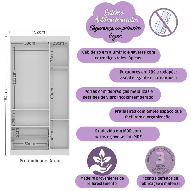 Guarda-roupa Infantil 92cm Com Vidro 3 Portas E 2 Gavetas Pirulito Multimóveis MP4467 Branco/madeiradoO Guarda-roupa Infantil 92cm com Vidro 3 Portas e 2 Gavetas Pirulito Multimóveis MP4467 traz a leveza que todo quarto de bebê merece, combinando beleza e funcionalidade em cada detalhe. Uma escolha prática e encantadora para acompanhar a rotina da família com mais organização e aconchego.Diferenciais:- 3 anos de garantia contra defeitos de fabricação e material.- Produzido em madeira de reflorestamento (MDP 12/15mm) com acabamento acetinado (cerca de 20% de brilho): sustentabilidade e durabilidade.- 3 portas e 2 gavetas (frontais em MDF): amplo espaço interno para organizar roupinhas e acessórios.- Detalhes de vidro incolor temperado 3mm: toque charmoso que permite visualizar o interior do móvel.- Corrediças telescópicas: permitem a abertura total e o manuseio silencioso das gavetas.- Cabideiro em alumínio: acomoda roupas longas e curtas para que não amassem.- Puxadores em ABS redondos e práticos.- Rodapé: visual harmonioso e facilidade na limpeza do ambiente.- Sistema antitombamento: proporciona segurança para o filho e tranquilidade aos pais.Conteúdo da Embalagem:1 (um) Guarda-roupaManual de MontagemKit FerragemDimensões do Produto Montado:Altura: 184cm | Largura: 92cm | Profundidade: 41cm*Você pode consultar as medidas detalhadas na imagem técnica do produto.Observações Importantes:*As cores do produto podem sofrer variações de tonalidade de acordo com as configurações do seu dispositivo.*Aqui na Loja Multimóveis, você pode concluir sua compra facilmente com toda segurança. A entrega é garantida e você está em 1° lugar.*Imagens meramente ilustrativas (decoração não inclusa).*O produto será entregue desmontado e não disponibilizamos o serviço de montagem. Acabamento: FF/Pintura UV | Material: MDP/MDF | Referência do Modelo: MP4467 | Instruções de Cuidado: Limpar com pano seco para retirar o pó. Não utilizar produtos químicos ou abrasivos a limpeza. Não aplicar lustra móveis. | Coleção: Pirulito | Sistema de Montagem: O produto acompanha manual de montagem juntamente com kit ferragem. O produto será entregue desmontado e não disponibilizamos o serviço de montagem. | Com Portas: Sim | Quantidade de Portas: 3 | Quantidade de Prateleiras: 4 | Corrediça: Telescópica | Quantidade de Gavetas: 2 | Material do Puxador: ABS | Altura Montado: 184 | Largura Montado: 92 | Profundidade Montado: 41 | Tamanho (L x A x P): 92 x 184 x 41 | Tonalidade: Branco | Produto: Guarda Roupa | Peso do Produto: 54 | Garantia do Fabricante: 3 | Tipo de Guarda-Roupa: Infantil | Fabricante: Multimóveis | Requer Montagem: Sim | Tamanho de Guarda-Roupa: Solteiro | Tipos de abertura das portas: Porta de dobradiça | Altura (cm): 184 cm | Largura (cm): 92 cm | Profundidade (cm): 41 cm | Estado de Origem: RS | Com prateleiras: Sim | Com gavetas: Sim | Com nichos: Não | Com baú: Não | Com cabideiros: Sim | Quantidade de nichos: 0 | Com espaço para calçado: Não | Com corrediças telescópicas: Sim | Tempo de Garantia: 3 meses | Produto Composto por: 1 guarda-roupa, manual de montagem e kit ferragem. | Destaque 1: Produzido em MDP/MDF: maior durabilidade e resistência. | Destaque 2: Cabideiro de alumínio para organizar roupas longas e curtas. | Destaque 3: Gavetas com corrediças telescópicas: abertura total e silenciosa. | Destaque 4: Tamanho do produto montado (L x A x P): 92 x 184 x 41 cm | Destaque 5: Detalhes de vidro incolor temperado nas portas: toque charmoso que permite visualizar o interior do móvel. | Tipo de produto: Guarda-roupa | Capacidade em peso: N/A | Tempo de montagem: N/A | Estilo: Moderno | Marca: Multimóveis | Com pés: Não | Com espelho: Não | Peso (kg): 54 kg | Quantidade de caixas de embalagem: 02 | Baterias são necessárias?: Não | Certificação de teste externa: N/A | Is Fragile: Sim | Dimensões do item P x L x A: depth#value=41;depth#unit=centimeters;width#value=92;width#unit=centimeters;height#value=184;height#unit=centimeters | Quantidade de itens: 1 | Número da peça: MP4467.499 | Peso do item: unit=kilograms;value=54 | Inclui manual de montagem: Sim | Materiais da estrutura: MDP | Tipo de Garantia: Garantia do Fabricante | Montagem: Necessita Montagem | País de Origem: Brasil | Componentes incluídos: Kit de instalação | Altura do Produto com Embalagem: 20 cm | Largura do Produto com Embalagem: 43 cm | Comprimento do Produto com Embalagem: 188 cm | Tipo da embalagem do vendor: Sem embalagem adicional | Peso do Produto com Embalagem: 54000 g | Cor: Branco/Madeirado