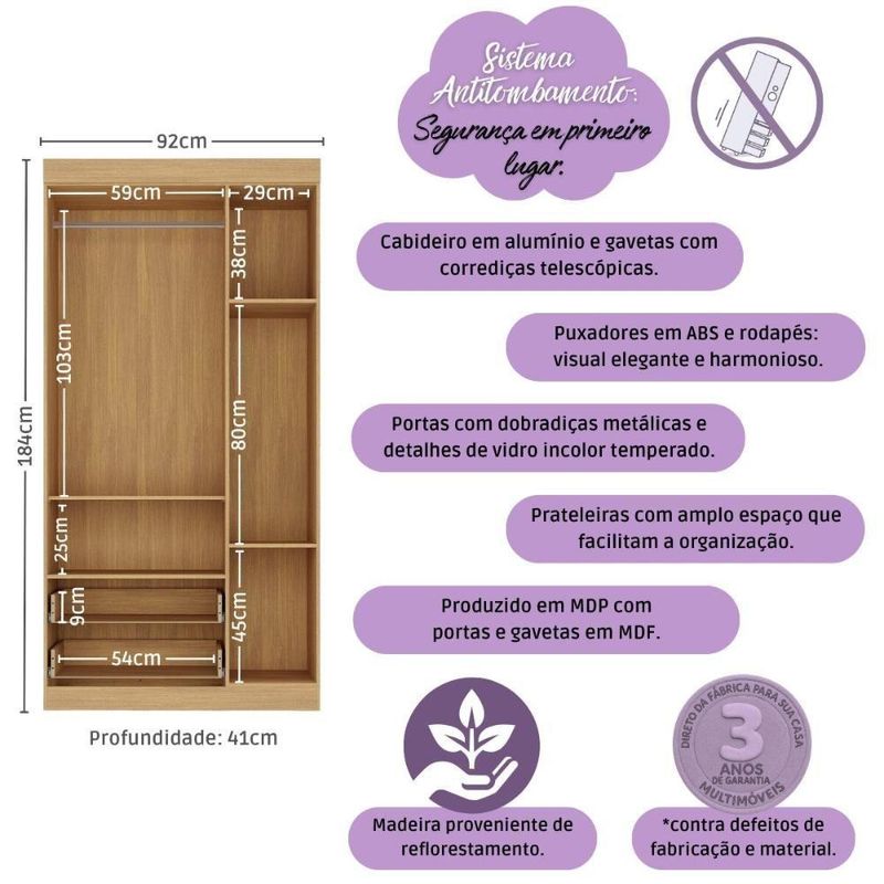 Guarda-roupa Infantil 92cm Com Vidro 3 Portas E 2 Gavetas Pirulito Multimóveis MP4467 MadeiradoO Guarda-roupa Infantil 92cm com Vidro 3 Portas e 2 Gavetas Pirulito Multimóveis MP4467 traz a leveza que todo quarto de bebê merece, combinando beleza e funcionalidade em cada detalhe. Uma escolha prática e encantadora para acompanhar a rotina da família com mais organização e aconchego.Diferenciais:- 3 anos de garantia contra defeitos de fabricação e material.- Produzido em madeira de reflorestamento (MDP 12/15mm) com acabamento acetinado (cerca de 20% de brilho): sustentabilidade e durabilidade.- 3 portas e 2 gavetas (frontais em MDF): amplo espaço interno para organizar roupinhas e acessórios.- Detalhes de vidro incolor temperado 3mm: toque charmoso que permite visualizar o interior do móvel.- Corrediças telescópicas: permitem a abertura total e o manuseio silencioso das gavetas.- Cabideiro em alumínio: acomoda roupas longas e curtas para que não amassem.- Puxadores em ABS redondos e práticos.- Rodapé: visual harmonioso e facilidade na limpeza do ambiente.- Sistema antitombamento: proporciona segurança para o filho e tranquilidade aos pais.Conteúdo da Embalagem:1 (um) Guarda-roupaManual de MontagemKit FerragemDimensões do Produto Montado:Altura: 184cm | Largura: 92cm | Profundidade: 41cm*Você pode consultar as medidas detalhadas na imagem técnica do produto.Observações Importantes:*As cores do produto podem sofrer variações de tonalidade de acordo com as configurações do seu dispositivo.*Aqui na Loja Multimóveis, você pode concluir sua compra facilmente com toda segurança. A entrega é garantida e você está em 1° lugar.*Imagens meramente ilustrativas (decoração não inclusa).*O produto será entregue desmontado e não disponibilizamos o serviço de montagem. Acabamento: FF/Pintura UV | Material: MDP/MDF | Referência do Modelo: MP4467 | Instruções de Cuidado: Limpar com pano seco para retirar o pó. Não utilizar produtos químicos ou abrasivos a limpeza. Não aplicar lustra móveis. | Coleção: Pirulito | Sistema de Montagem: O produto acompanha manual de montagem juntamente com kit ferragem. O produto será entregue desmontado e não disponibilizamos o serviço de montagem. | Com Portas: Sim | Quantidade de Portas: 3 | Quantidade de Prateleiras: 4 | Corrediça: Telescópica | Quantidade de Gavetas: 2 | Material do Puxador: ABS | Altura Montado: 184 | Largura Montado: 92 | Profundidade Montado: 41 | Tamanho (L x A x P): 92 x 184 x 41 | Tonalidade: Branco | Produto: Guarda Roupa | Peso do Produto: 54 | Garantia do Fabricante: 3 | Tipo de Guarda-Roupa: Infantil | Fabricante: Multimóveis | Requer Montagem: Sim | Tamanho de Guarda-Roupa: Solteiro | Tipos de abertura das portas: Porta de dobradiça | Altura (cm): 184 cm | Largura (cm): 92 cm | Profundidade (cm): 41 cm | Estado de Origem: RS | Com prateleiras: Sim | Com gavetas: Sim | Com nichos: Não | Com baú: Não | Com cabideiros: Sim | Quantidade de nichos: 0 | Com espaço para calçado: Não | Com corrediças telescópicas: Sim | Tempo de Garantia: 3 meses | Produto Composto por: 1 guarda-roupa, manual de montagem e kit ferragem. | Destaque 1: Produzido em MDP/MDF: maior durabilidade e resistência. | Destaque 2: Cabideiro de alumínio para organizar roupas longas e curtas. | Destaque 3: Gavetas com corrediças telescópicas: abertura total e silenciosa. | Destaque 4: Tamanho do produto montado (L x A x P): 92 x 184 x 41 cm | Destaque 5: Detalhes de vidro incolor temperado nas portas: toque charmoso que permite visualizar o interior do móvel. | Tipo de produto: Guarda-roupa | Capacidade em peso: N/A | Tempo de montagem: N/A | Estilo: Moderno | Marca: Multimóveis | Com pés: Não | Com espelho: Não | Peso (kg): 54 kg | Quantidade de caixas de embalagem: 02 | Baterias são necessárias?: Não | Certificação de teste externa: N/A | Is Fragile: Sim | Dimensões do item P x L x A: depth#value=41;depth#unit=centimeters;width#value=92;width#unit=centimeters;height#value=184;height#unit=centimeters | Quantidade de itens: 1 | Número da peça: MP4467.499 | Peso do item: unit=kilograms;value=54 | Inclui manual de montagem: Sim | Materiais da estrutura: MDP | Tipo de Garantia: Garantia do Fabricante | Montagem: Necessita Montagem | País de Origem: Brasil | Componentes incluídos: Kit de instalação | Altura do Produto com Embalagem: 20 cm | Largura do Produto com Embalagem: 43 cm | Comprimento do Produto com Embalagem: 188 cm | Tipo da embalagem do vendor: Sem embalagem adicional | Peso do Produto com Embalagem: 54000 g | Cor: Madeirado