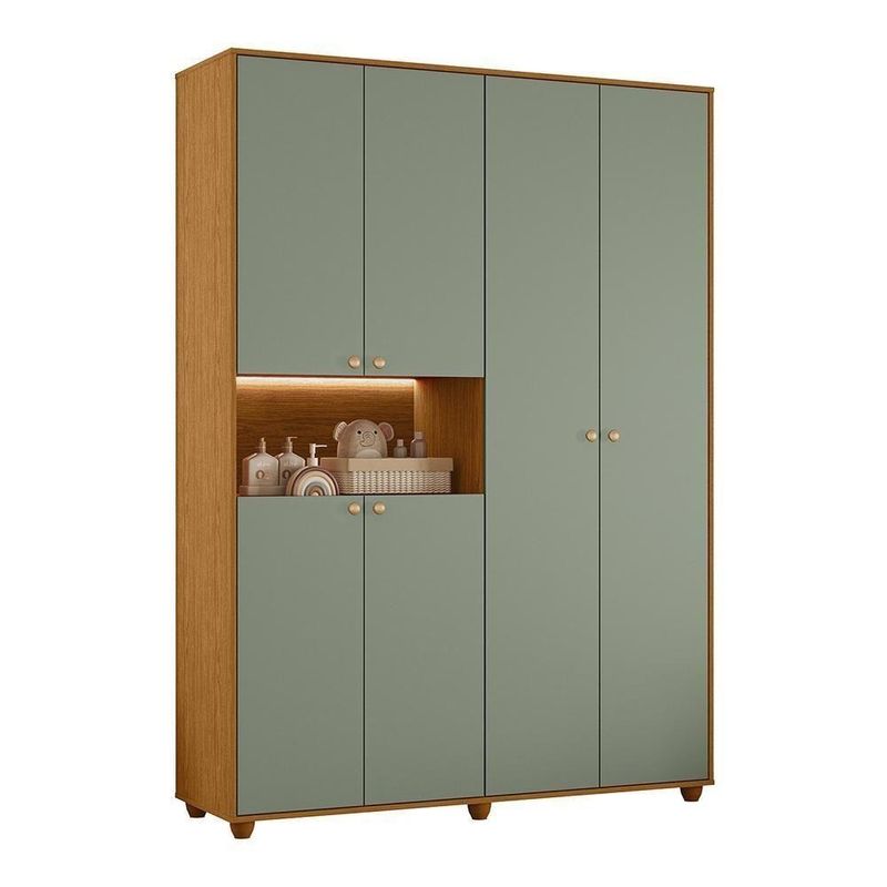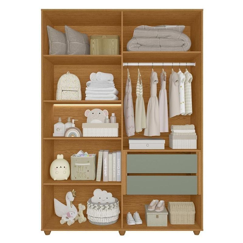 Guarda Roupa Infantil Vittoria 6 Portas E 2 Gavetas Cinamomo/sálvia - Móveis Albatroz Cinamomo/sálviaGuarda Roupa Infantil Vittoria 6 Portas e 2 Gavetas - Móveis Albatroz O Guarda-Roupa Infantil Vittoria une design moderno e praticidade. Produzido em MDP com pintura UV, possui seis portas com dobradiças slow motion, duas gavetas com corrediças telescópicas, prateleiras internas, cabideiro em alumínio e nicho central com iluminação em LED, oferecendo ótimo aproveitamento do espaço e funcionalidade no dia a dia.ESPECIFICAÇÕES: - Estrutura em MDP - Pintura UV - 6 Portas - Dobradiças slow motion - Prateleiras internas - Puxadores em ABS metalizado - Cabideiro em alumínio - 2 Gavetas - Corrediças telescópicas - Pés em ABS - Nicho central - Iluminação com fita LED - Amplo espaço interno Dimensões: Tamanho do Produto (L x A x P): 150 x 210 x 47 cm Garantia: 3 meses Montagem: O Produto vai desmontado com manual e todos acessórios. Recomendamos que a montagem seja feita por um profissional Recomendação de Limpeza: Utilize pano levemente úmido Observações: - A LOJA se responsabilizará pela entrega dos produtos até aonde as rodovias alcançam, entregas fluviais ou aéreas devem ser cotadas a parte. - As imagens são ilustrativas, não acompanham objetos de decoração. - Pode haver alguma diferença de tonalidade entre a imagem e o produto, por conta do tratamento de imagens e a calibração de cores da sua tela. - A montagem será de responsabilidade do comprador. Entregamos até a porta de entrada da residência ou até a portaria do condomínio. Não nos responsabilizamos, no ato da entrega, por subir escadas/elevadores ou transporte por guincho em apartamentos. Eventuais despesas são de responsabilidade do comprador. - Confira as dimensões do produto no momento da compra e certifique-se de que passará normalmente por supostos elevadores, portas, escadas e/ou corredores de sua residência. Para mais informações, acesse nossa Central de Atendimento. NA Cinamomo/Sálvia