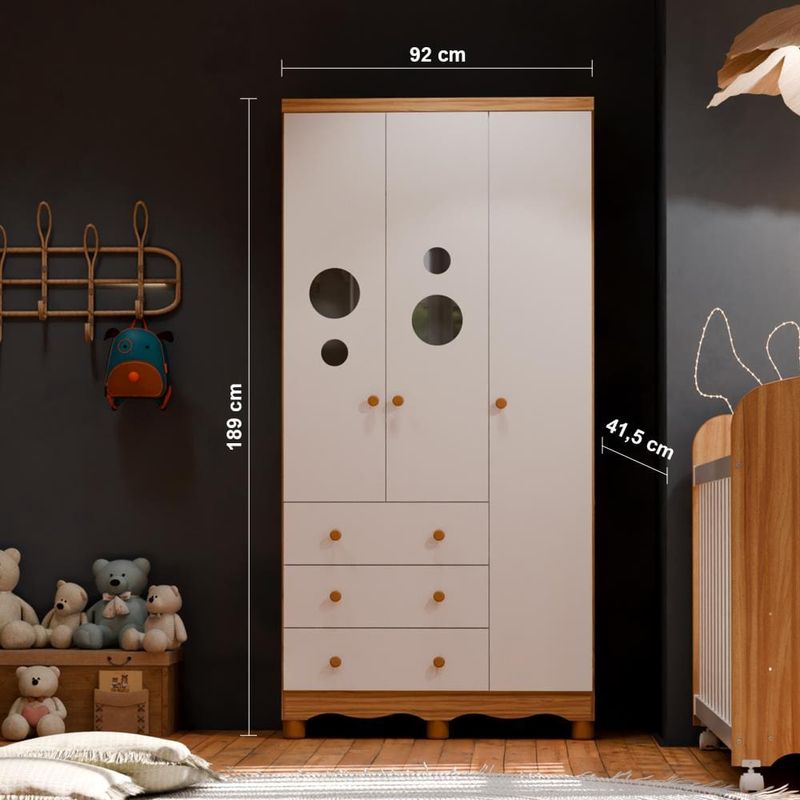 Decore com Qualidade De Construção O Armário Duda Plus foi desenvolvido para compor a decoração e garantir a organização no quarto dos pequenos. Fabricado completamente em MDF, conta com pintura atóxica, proporcionando segurança para o uso doméstico. Design Prático e Resistente A estrutura do armário é feita em chapa de 12 mm, reforçando sua resistência, enquanto os pés são injetados em plástico de alta durabilidade. Os puxadores também são feitos de plástico, garantindo praticidade no manuseio. Mais Organização Para Sua Casa A parte interna do armário disponibiliza cabideiros metálicos, o que traz uma organização eficiente para pendurar as roupas. Já as gavetas são equipadas com corrediças telescópicas, proporcionando um deslize suave e silencioso ao abrir e fechar. Personalize Seu Ambiente O móvel disponibiliza dois modelos de rodapés que podem ser escolhidos durante a montagem. Suas portas apresentam detalhes com PETG cristal, adicionando um toque de elegância ao design do armário e complementando a decoração do espaço.
