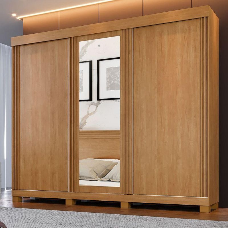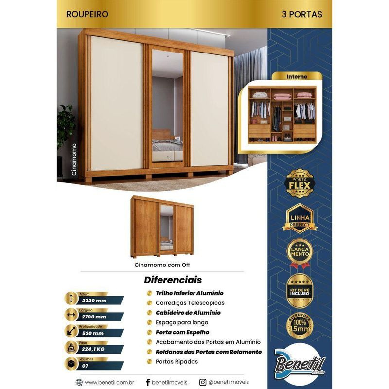 Guarda Roupa Sergipe 3 Porta Ripado 6 Gavetas 9 Prateleiras Cinamomo-off FlexO Guarda-Roupa Sergipe e produzido em chapa de 15 mm que garante robustez e maior vida util, contem 3 portas ripadas e uma espelhada, 9 prateleiras, 6 gavetas com corredicas telescopica, cabideiro em aluminio e acabamento das portas em aluminio, trilho inferior de aluminio que garante suavidade na abertura das portas, espaco para longos, pes inclusos no produto, otimo custo-beneficio. Sua fabricacao utiliza a linha mdp perffect, que une a sustentabilidade a inovacao tecnologica, proporcionando durabilidade e facil limpeza; nosso revestimento reproduz os veios naturais da madeira que podem ser sentidos pelo tato, inspirando sofisticacao ao mobiliario. Pelo revestimento ser termofundido com alta pressao e temperatura apresenta maior compactacao das camadas o que elimina a possibilidade de empenamento do painel; superior resistencia de fixacao do parafuso o que aumenta a vida util do movel e alem disso atende aos testes definidos em normas, conferindo resistencia a: abrasao; riscos; agentes manchadores; aderencia.; conta com boa resistencia, e facil de limpar e e ecologicamente correto, pois utiliza madeira de reflorestamento, evitando o desmatamento.Caracteristicas: Material principal: MDP Espessura da chapa: 15 mm Escala de brilho: fosco Acabamento: Pintura UV Sistema de montagem: parafuso, cavilha e cantoneiras metalicas Quantidade de Portas: 03 Quantidade de Gavetas: 06 Quantidade de Prateleiras: 09 Experiencia touch e wood, lamina com textura super-realista que permite a sensacao de toque autentico da madeira natural. Dimensoes: Altura: 230 cm Largura: 270 cm Profundidade: 52 cm Peso: 222 Kg Garantia do fornecedor: 3 meses Recomendacoes de uso, manutencao e limpeza: Limpar com flanela ou pano macio e seco, nao utilizar produtos abrasivos, desengordurantes, alcool ou solvente. Nao expor o produto diretamente a luz solar e a umidade.