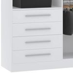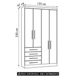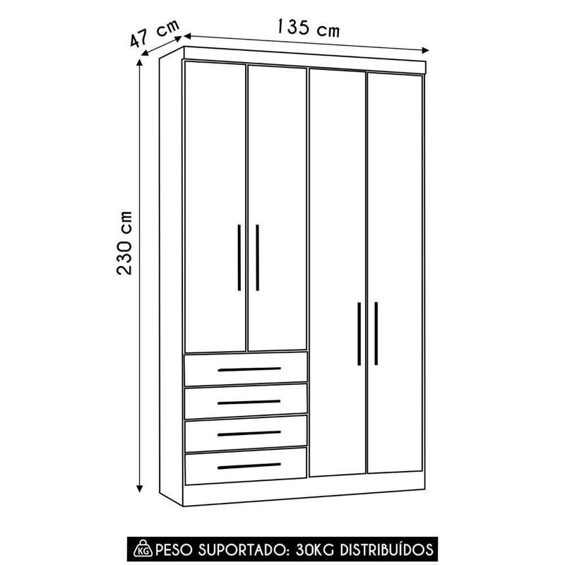 Guarda Roupa Solteiro 135cm 4 Portas 4 Gavetas Taiga Branco L01 - MpozenatoGuarda Roupa Solteiro 135cm 4 Portas 4 Gavetas Taiga Branco L01 - MpozenatoEsse Guarda Roupa de Solteiro é uma opção completa para quem quer organização e estilo no Quarto. Com estrutura resistente em MDP, ele oferece durabilidade e acabamento de qualidade.Possui quatro portas com dobradiças metálicas e puxadores em polímero, além de quatro gavetas externas com corrediças telescópicas e puxadores do mesmo material, garantindo praticidade e facilidade no uso diário.O rodapé integrado elimina a necessidade de pés convencionais, proporcionando estabilidade e um visual mais limpo, internamente, o maleiro superior funciona como uma prateleira ampla para acomodar diversos objetos.Além disso, conta com dois cabideiros e quatro prateleiras, oferecendo ótimo espaço para guardar roupas, acessórios e outros itens com muito mais organização e charme.ESPECIFICAÇÕESDimensões do ProdutoLargura: 135 cm.Altura: 230 cm.Profundidade: 47 cm.Peso: 108 Kg.Características do ProdutoMaterial da Estrutura: MDP 15mm.Peso Suportado: 30 kg distribuídos.Acabamento: Finish Foil (FF).Escala de Brilho: Fosco.Possui Prateleira: Sim.Quantidade de Prateleiras: 4 Prateleiras.Possui Maleiro: Sim.Possui Nicho: Não.Possui Porta: Sim.Quantidade de Portas: 4 Portas.Tipo de Porta: Convencional.Possui Gaveta: Sim.Quantidade de Gavetas: 4 Gavetas.Tipo das Corrediças: Telescópicas.Possui Puxador: Sim.Material dos Puxadores: Polímero.Possui Cabideiro: Sim.Quantidade de Cabideiros: 2 Cabideiros.Possui Pés: Não.Diferenciais:- Design moderno.- Amplo espaço interno.- Cabideiro em alumínio.- Corrediças telescópicas.Sistema de Montagem: Cavilhas/Parafusos/Minifix.Manual de Montagem: Sim.Complexidade da Montagem: Baixo.Volumes: 3 Volumes.Conteúdo da Embalagem: 1 Guarda Roupa.Garantia do Fabricante: 90 dias contra defeito de fabricação.Montagem: Recomendamos que seja feita por um profissional.Recomendação de Limpeza: Utilize pano úmido. Quantidade de caixas de embalagem: 3 | Marca: Mpozenato | Largura: 135 cm | Modelo: Taiga | Profundidade: 47 cm | Altura: 230 cm | Inclui manual de montagem: Sim | Requer montagem: Sim | Tipo de móvel: Cômoda | Nome ML: Guarda Roupa Solteiro 135cm 4 Portas 4 Gavetas Taiga Bco L01