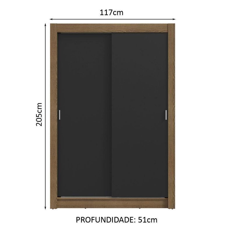 Guarda-roupa Solteiro 2 Portas De Correr 2 Gavetas Rustic/preto Vivare Madesa Rustic/pretoMantenha seus itens organizados e ao alcance com o Guarda-Roupa Solteiro Vivare da Madesa, uma escolha prática e moderna para o seu quarto.Portas de correr: O móvel é equipado com portas de correr que deslizam suavemente, graças aos trilhos em alumínio, garantindo um funcionamento tranquilo e sem esforço.Organização ideal: Perfeito para um quarto de solteiro, o modelo conta com diversos nichos internos e duas gavetas, que facilitam a organização de roupas, calçados e acessórios. O tubo cabideiro metálico é ideal para pendurar roupas longas.Acabamento de qualidade: Possui acabamento combinando os tons amadeirado Rustic e preto. É aplicado em Pintura Poliéster ecológica de sete camadas, que proporciona maior durabilidade e proteção.Medidas totais: 205 cm de altura x 117 cm de largura x 51 cm de profundidade.O que você recebe:- Um (1) Guarda-roupa com duas portas de correr- Ferragens e manual de montagemCódigo do produto: 11947K2GÉ bom saber:- As imagens são meramente ilustrativas- A Madesa não disponibiliza de montagem COR: Preto | Garantia: 3 meses contra de fabricação | Dimensões - Altura: 205 cm | Dimensões - Largura: 117 cm | Dimensões - Profundidade: 51 cm | Produto: Guarda-Roupa | Marca: Madesa | Peso aproximado: 68 kg | Material: MDP | RBN: Casa/Móveis/Móveis para o Quarto/Armários e Guarda-Roupas | Estado de Origem: RS | Material para Filtro: MDP | Conteúdo da embalagem: 1 Guarda-Roupa | Instruções/Cuidados: Utilize um pano limpo, levemente umedecido e seque em seguida a superfície. Não usar produtos químicos ou abrasivos para a limpeza. Recomendamos polir seu móvel com lustra-móveis duas a três vezes por ano. | Quantidade de gavetas: 2 | Quantidade de portas: 2 | Produto precisa de Montagem?: Sim | Altura do Produto com Embalagem (cm): 20,6 | Largura Produto Com Embalagem (cm): 61,3 | Comprimento Produto Com Embalagem (cm): 217,8 | Peso Produto Com Embalagem (Kg): 68,5 | Descrição do Tamanho: 205 xm x 117 cm x 51 cm | Nome do Simples no Fornecedor: Guarda-Roupa Solteiro 2 Portas de Correr 2 Gavetas Rustic/Preto Vivare Madesa | do Fabricante: | Fabricante: Madesa | Qauntidade de caixas de embalagem: 3 | Tipo de Guarda Roupa: Solteiro Cor: Rustic/Preto