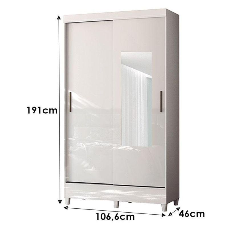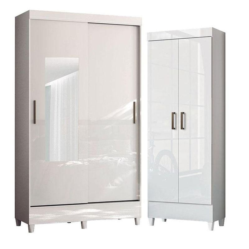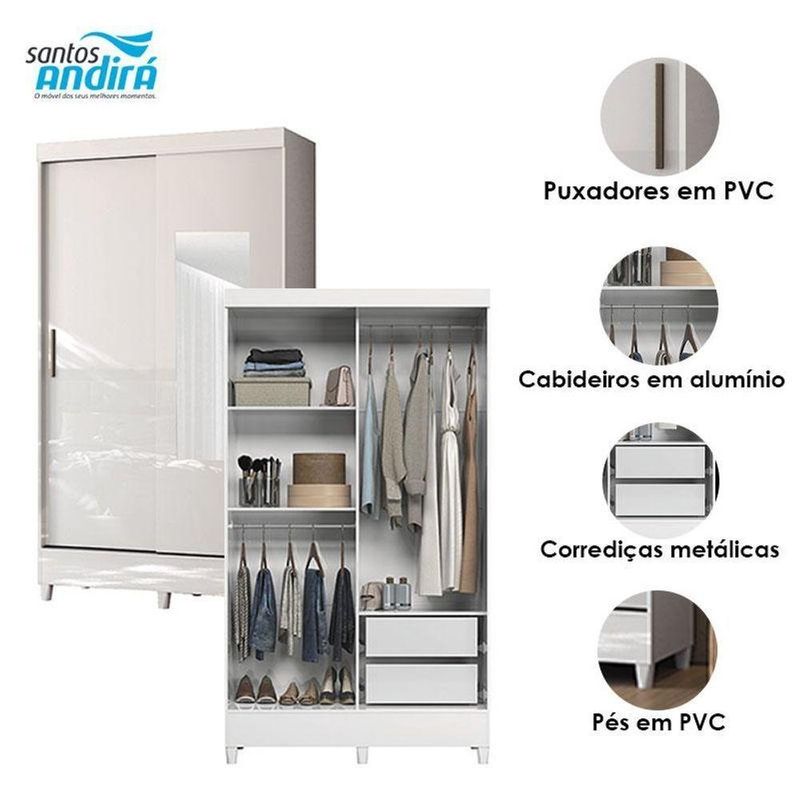 Guarda Roupa Solteiro 2 Portas De Correr Com Pés E Espelho Fit Com Armário Multiuso Fit Branco Brilho - Santos AndiráGuarda Roupa Solteiro 2 Portas de Correr com Pés e Espelho Fit com Armário Multiuso Fit Branco - Santos AndiráPrático e moderno, o Guarda-Roupa Fit da Santos Andirá é ideal para otimizar espaços. Possui 2 portas, sendo uma com espelho, além de armário multiuso integrado, oferecendo excelente organização para roupas, calçados e acessórios. Acabamento na cor Jequitibá, que traz elegância ao ambiente. Produto resistente, funcional e perfeito para o dia a dia.Guarda Roupa Solteiro 2 portas de correr com espelho e pés Fit Branco Acetinado- Santos AndiráCaracterísticas técnicas:- Desenvolvida em MDP- Pintura em Verniz Brilhante- 2 Gavetas com Corrediças Metálicas- Puxadores em PVC- Móvel 100% em 12 mm- 2 Cabideiros em alumínioDimensões:Altura: 191 cmLargura: 106,6 cmProfundidade: 46 cmMultiuso com pés Fit Branco Acetinado - Santos AndiráCaracterísticas técnicas:- Desenvolvida em MDP- Pintura em verniz brilhante- Puxadores em PVC- Pés em PVC- Amplas prateleirasDimensões:Altura: 165,5 cmLargura: 60 cmProfundidade: 31,2 cmInformações importantes:* Não acompanha decorações e acessórios* Nossas cargas possuem seguro, portanto, no ato da entrega, confira a quantidade de volumes recebida, e também o estado da embalagem. Se houver qualquer inconsistência, não assine o comprovante de entrega;* O armazenamento do produto no endereço de entrega é de responsabilidade do comprador. Evite apoiar o produto na vertical, bem como evite áreas que deixem o produto exposto a chuva ou umidade excessiva;* Pequenas variações de tonalidade são possíveis, em razão da diferença de resolução da tela onde o anúncio está sendo visualizado. Se notar diferença expressiva, comunicar a empresa antes de efetuar a montagem;* O serviço de entrega contratado contempla a entrega até a primeira área coberta ou portaria, não sendo coberto o ato de subir escadas/elevadores ou adentrar nas residências;* Não nos responsabilizamos pela montagem, desmontagem ou instalação do produto.