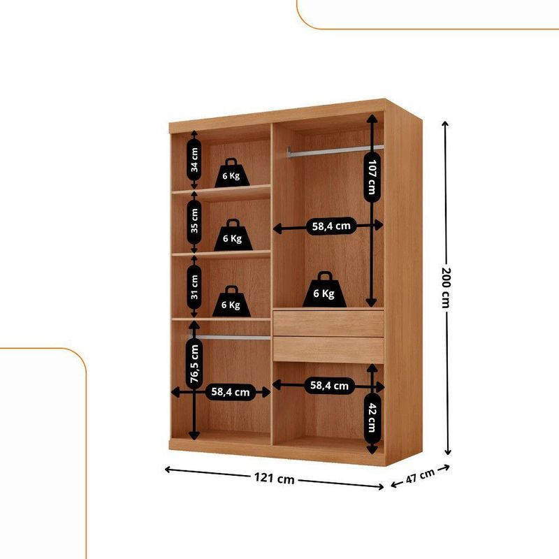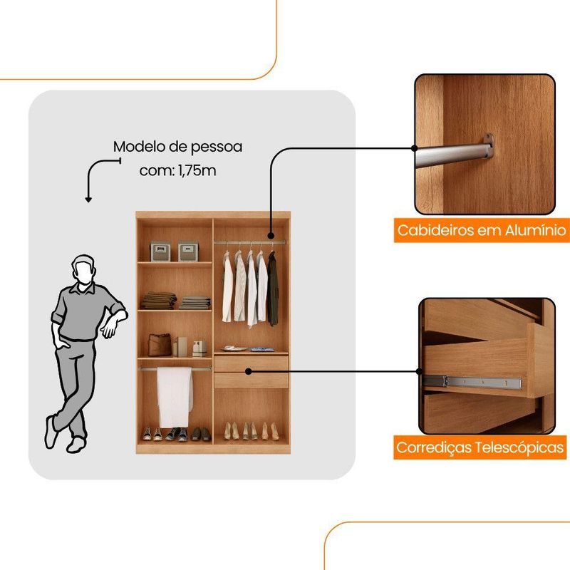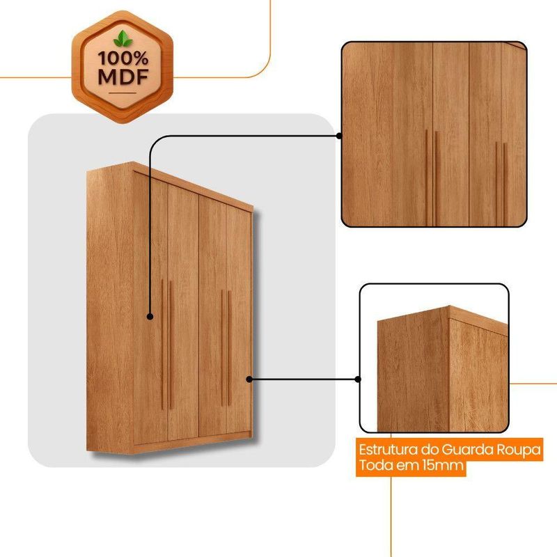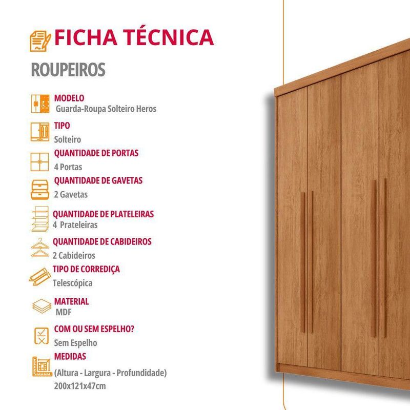 Guarda Roupa Solteiro Heros 4 Portas E 2 Gavetas Moderna NaturalleGuarda Roupa Solteiro Heros 4 Portas e 2 Gavetas MDF ModernaO Guarda-Roupa Heros com 4 portas e a escolha perfeita para quem aprecia um visual classico e elegante. Produzido 100 em MDF, ele combina durabilidade com um design sofisticado. O espaco interno e cuidadosamente dividido, permitindo uma organizacao pratica de suas roupas e objetos. Com 4 portas, 2 gavetas com corredicas telescopicas de facil abertura, dois cabideiros e compartimentos ideais para armazenar calcados, o Heros oferece funcionalidade completa!Caracteristicas:Material da Estrutura: 100MDFTipo de Acabamento: Pintura UVMaterial das Corredicas: TelescopicaMaterial dos Cabideiros: AluminioDimensoes do Roupeiro:Largura: 121 cmAltura: 200 cmProfundidade: 47 cmPeso: 73,07 kgGarantia do Fornecedor: 3 mesesInformacoes Importantes:As tonalidades das cores podem sofrer alteracao de acordo com a configuracao de cada monitor.Os objetos que ambientam as fotos nao acompanham o produto.Nao disponibilizamos a montagem do produto.Nao nos responsabilizamos por danos no produto causado por montagem.Verifique as dimensoes do produto e certifique-se que o percurso que ele fara ate o local de uso permite sua passagem.Para mais informacoes confira as politicas de entrega do site.Favor verificar o produto no ato da entrega e em caso de problemas decorrentes no transporte (arranhados, quebra, batida, amassados) deve-se efetuar a ressalva na nota fiscal para conhecimento da transportadora e comunicar imediatamente a loja.Moderna Mobilia reserva o direito de alterar as especificacoes tecnicas sem previo aviso.As medidas contidas no site podem sofrer variacoes de acordo com a montagem, tipo de costura etc.