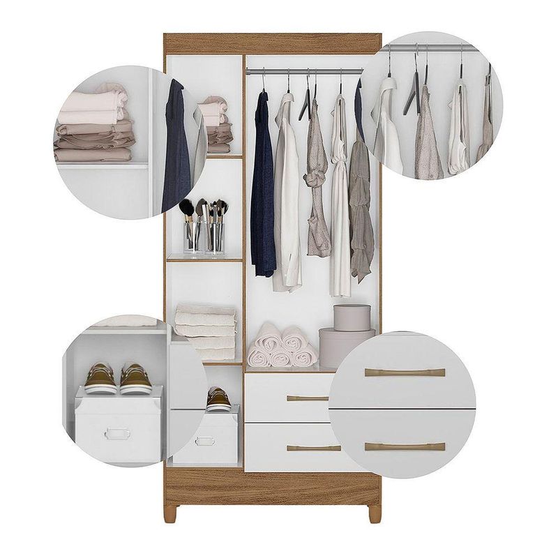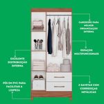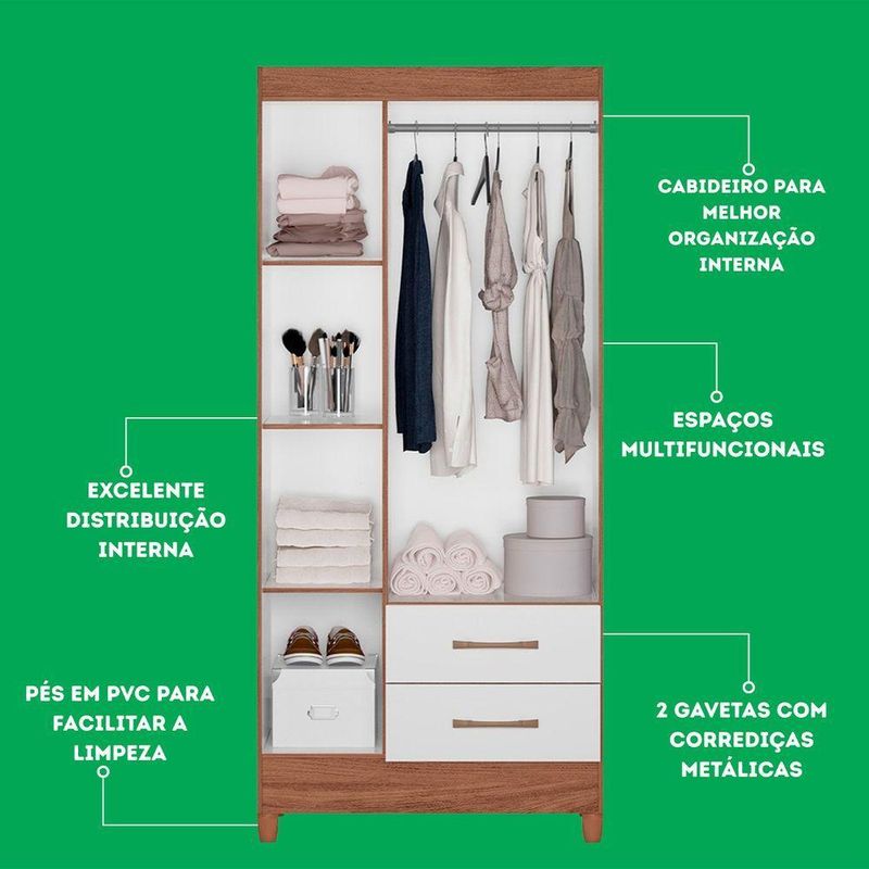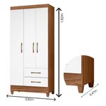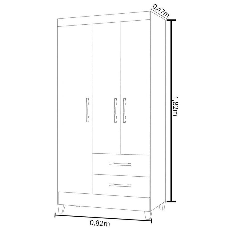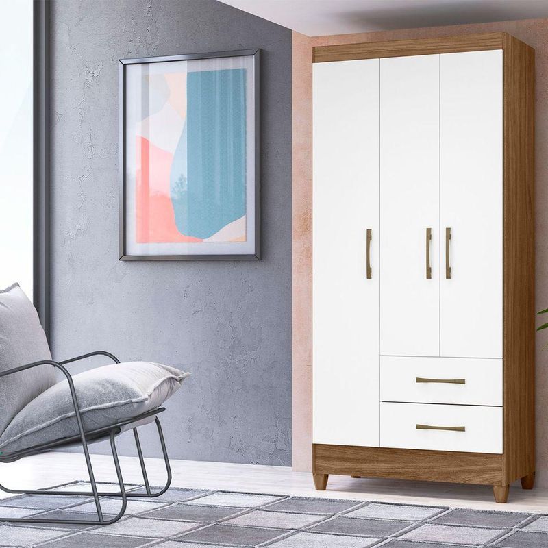 Guarda Roupa Solteiro Quarto Pequeno 3 Portas 2 Gavetas Lima Naturale Com Branco Com design compacto e funcional, o Guarda-Roupa Lima é perfeito para quem busca praticidade sem abrir mão do estilo. Ideal para quartos menores, ele oferece excelente aproveitamento interno e uma organização inteligente, acomodando roupas e acessórios de forma prática e acessível.Seu formato com 3 portas de giro e 2 gavetas proporciona versatilidade e conforto no uso diário. O modelo faz parte da linha Essencial, reconhecida pela leveza visual e pela durabilidade. Os puxadores em tom bronze trazem um toque moderno, enquanto os pés em PVC facilitam a limpeza e garantem estabilidade ao móvel.Dimensões:Altura: 182 cmLargura: 82 cmProfundidade: 47 cmDiferenciais:- 3 portas de giro com dobradiças metálicas resistentes- 2 gavetas com corrediças metálicas de fácil deslizamento- Puxadores em tom bronze, modernos e ergonômicos- Cabideiro interno que otimiza o espaço para roupas longas e curtas- Espaços multifuncionais ideais para organização diária- Pés em PVC que facilitam a limpeza e aumentam a durabilidade- Montagem flexível e estrutura compacta, ideal para diferentes ambientes