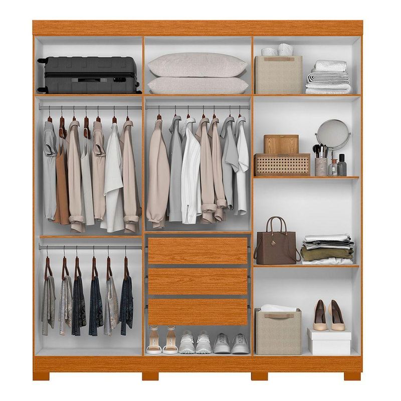 Guarda Roupa Vinci 6 Portas 3 Gavetas Quarto Cinamomo Com Off White - AlbatrozO Guarda-Roupa Vinci une design moderno, praticidade e excelente qualidade de acabamento. O modelo oferece resistência e durabilidade superiores, mantendo um visual sofisticado que valoriza qualquer ambiente.Seu interior é amplo e bem distribuído, com prateleiras, cabideiros e gavetas que facilitam a organização das roupas e acessórios.As portas de abrir garantem total acesso ao espaço interno, enquanto o acabamento refinado confere um toque elegante e contemporâneo ao quarto.Dimensões:Altura: 218cmLargura: 200cmProfundidade: 47cmObservações:- Portas de abrir com dobradiças metálicas resistentes- 3 Gavetas internas com corrediças telescópicas- Amplo espaço interno com prateleiras e cabideiros bem distribuídos- Acabamento moderno e resistente- Design elegante e funcional- Puxador de MDF revestido- Puxadores em alumínio